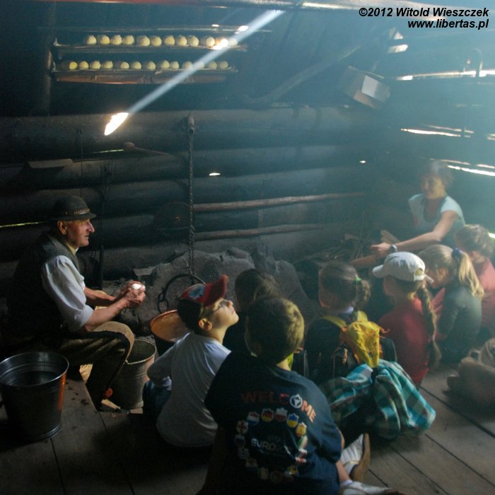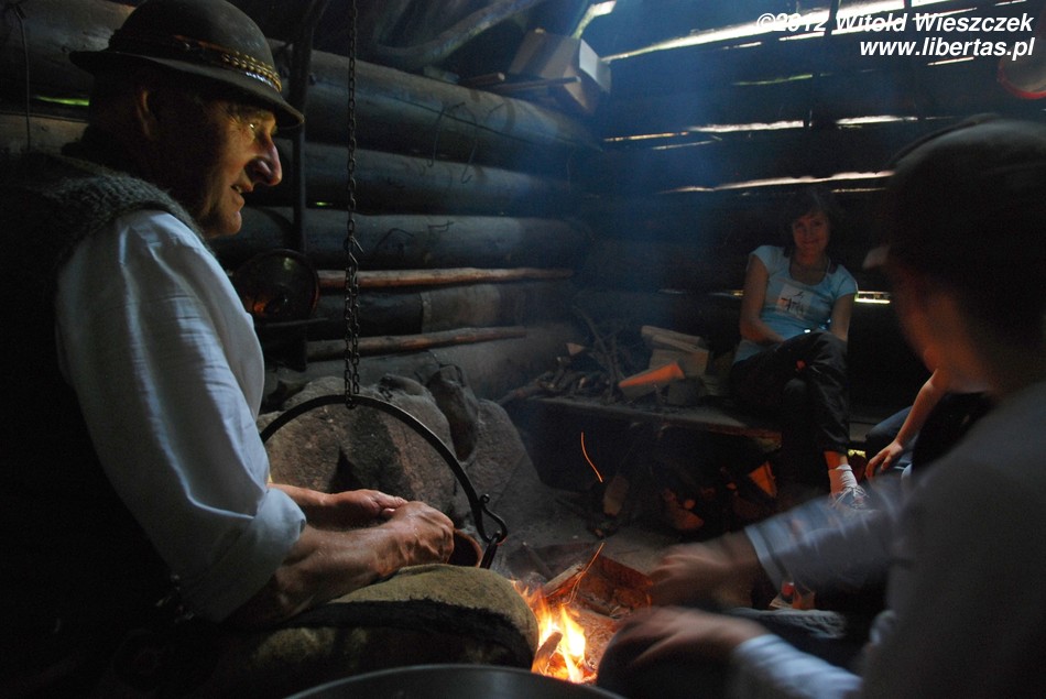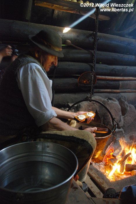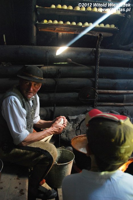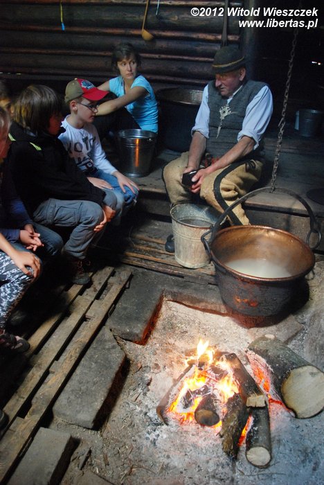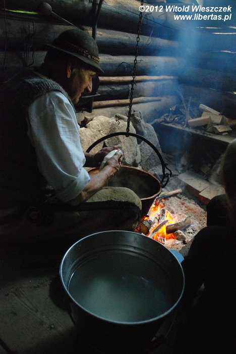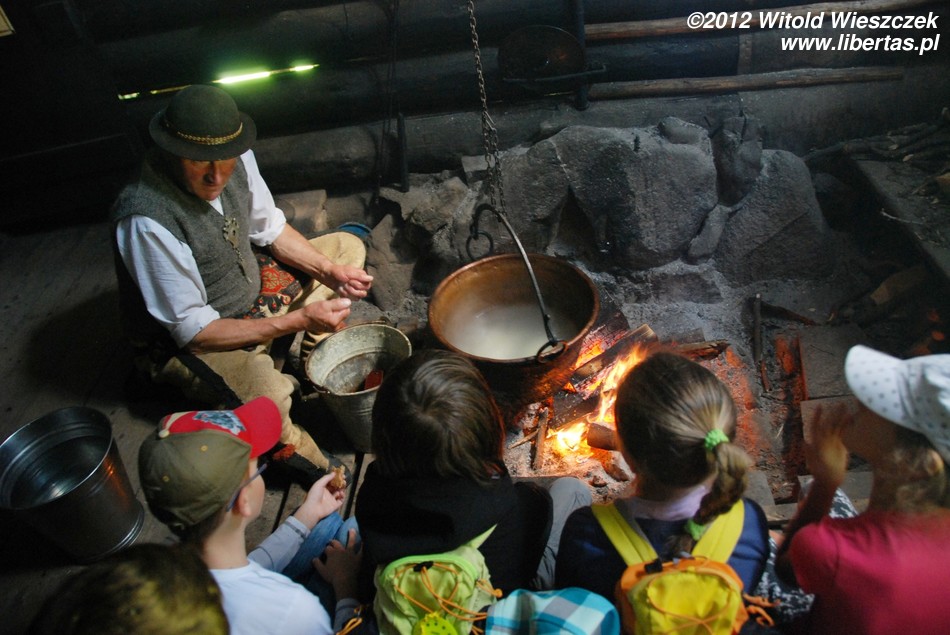 Sobotnie warsztaty okazały się ciekawsze niż mógłbym przypuszczać. W niedzielę stawiliśmy się zatem punktualnie pod Willą Oksza na kolejne z zaplanowanych spotkań. Tym razem udaliśmy się do bacówki, gdzie prawdziwy baca robi prawdziwe oscypki. Baca na powitanie poczęstował nas pyszną żętycą, a potem zaprosił do zadymionego wnętrza bacówki. Już po chwili wędziliśmy się razem z ustawionymi na półce świeżymi oscypkami i słuchaliśmy bacy, który prawił o swojej robocie z typowo góralskim akcentem i poczuciem humoru.
