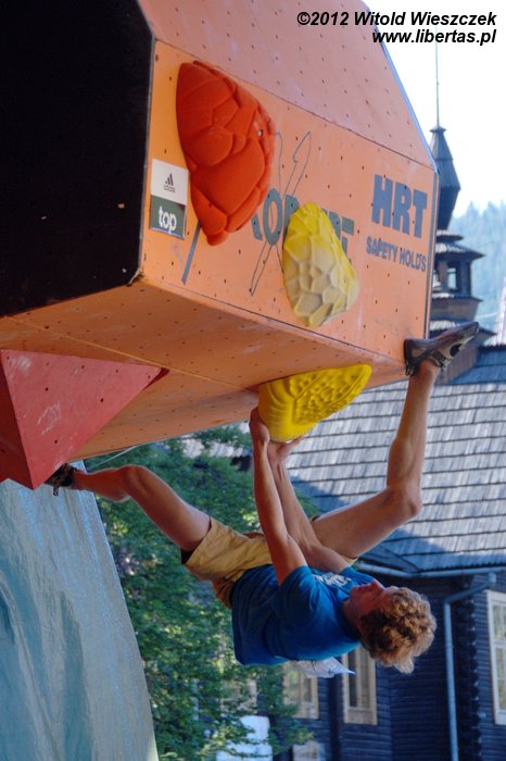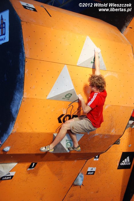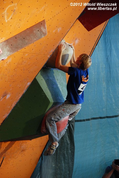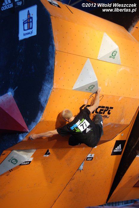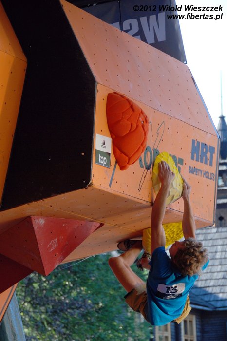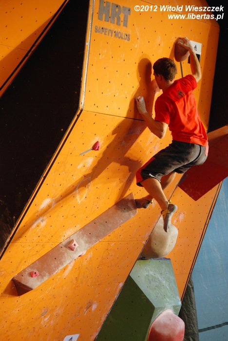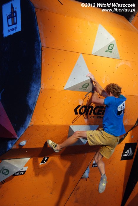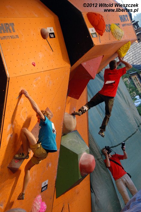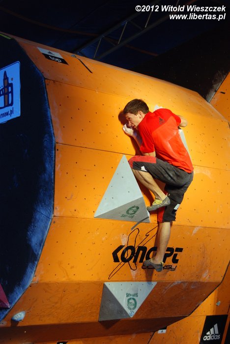 Eliminacje zawodów Adidas Zako Boulder Power 2012 odbyły się w sobotę przy Dworcu Tatrzańskim. Półfinały i finały mężczyzn oraz kobiet dzień później. Mnie udało się obejrzeć niedzielne półfinały mężczyzn, w których 26 zawodników zmagało się z czterema problemami autorstwa Adama Pustelnika. Zawodnicy pojawiali się w kolejności od tych sklasyfikowanych najniżej, więc początkowo można było odnieść wrażenie, że przygotowane problemy są nie do pokonania. Najszybciej top został osiągnięty na ściance numer 2. Na ściance numer 3 pierwszą przeszkodę udało się pokonać dopiero Krzysztofowi Szalachowi, a ścianka numer 4 pozostała niezdobyta. Do finału przeszli: Aleksander Romanowski, Jakub Główka, Jakub Jodłowski, Tomasz Oleksy, Bartosz Jarosiewicz i wspomniany już Krzysztof Szalacha.