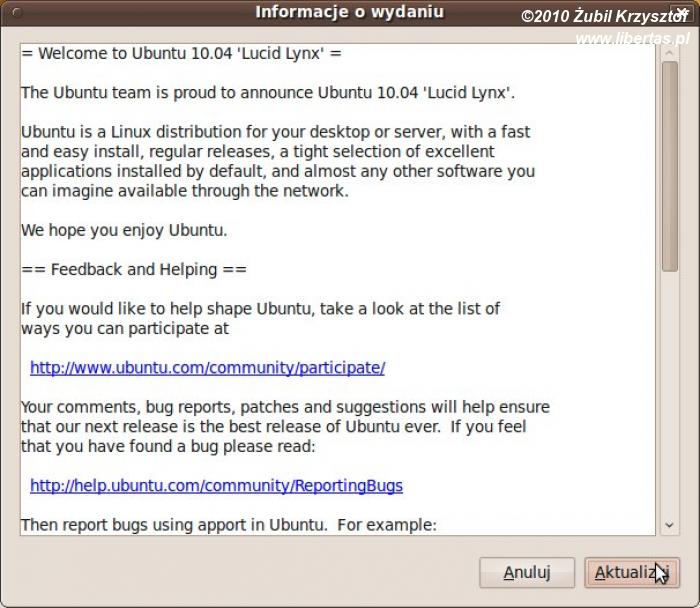 Zostaniemy poproszeni o zapoznanie się z informacjami dotyczącymi obecnego wydania, żeby przejść do kolejnego kroku klikamy na przycisk Aktualizuj.
