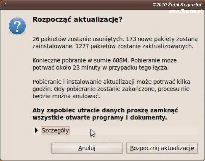 sudo mount -o loop ~/Pulpit/ubuntu-10.04-alternate-i386.iso /media/cdrom0po wpisaniu hasła naszego użytkownika (nie widać wpisywanych znaków) uruchomi się program, który przeprowadzi aktualizację z płyty. Gdyby program się nie uruchomił, naciskamy Alt+F2 i w oknie „Uruchom program” wpisujemy polecenie: