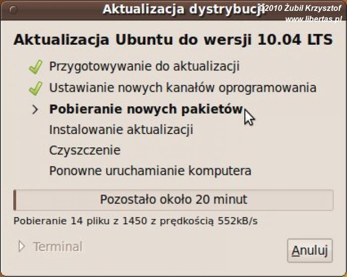 Teraz możemy zaparzyć dobrej kawy i obserwować postęp pobierania plików i późniejszą aktualizację systemu. Istnieje prawdopodobieństwo że pojawią się prośby o potwierdzenie nadpisania plików konfiguracyjnych. Na koniec wystarczy ponownie uruchomić system.