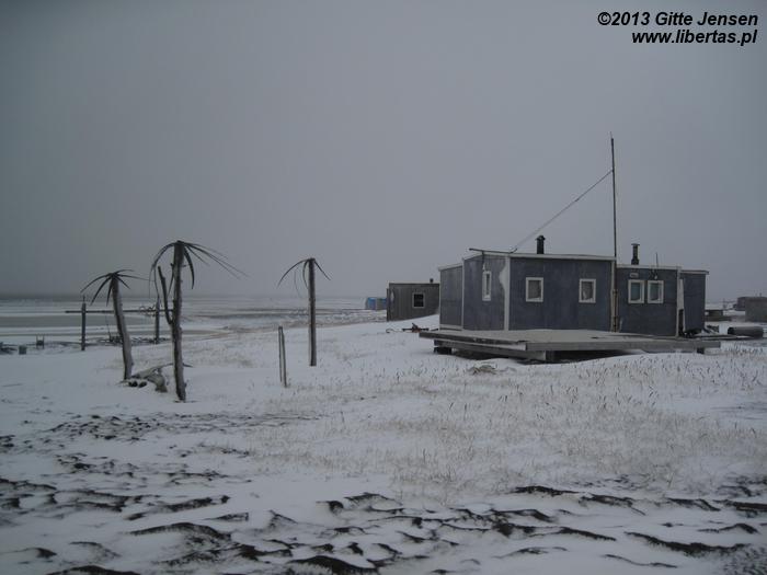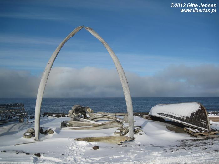 Wrześniowa pogoda w Barrow oznacza spore opady śniegu i pokryte lodem drogi. Wynajętym hammerem wybrałam na Point Barrow, w nadziei na spotkanie białych niedźwiedzi. Niestety musiałam zadowolić się mewami, fokami i kośćmi wielorybów. Nasz przewodnik obwiózł mnie także trochę po miasteczku, sprzedał kilka lokalnych ploteczek, a następnie sam wrócił na przylądek. Co ciekawe, na ulicach Barrow można często spotkać polarne niedźwiedzie, które schodzą się do osady w poszukiwaniu jedzenia, toteż spacer po miasteczku może się źle skończyć. Zdecydowanie bezpieczniej jest poruszać się taxi lub wynajętym samochodem. Pomimo że w mieście nie można legalnie kupić alkoholu (nie muszę chyba wyjaśniać dlaczego), na ulicach roi się od podchmielonych Inuitów. Jak więc widać, produkcja bimbru kwitnie.