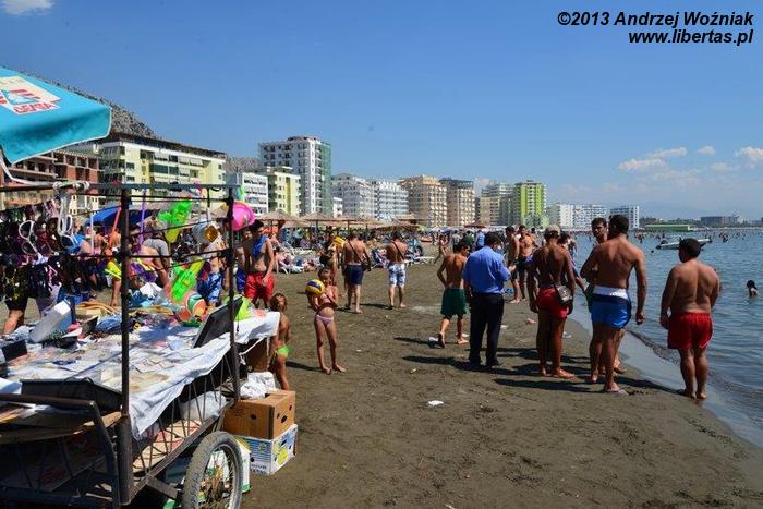 Postanowiliśmy również wybrać się nad morze, żeby zobaczyć, jak wyglądają kurorty nadmorskie i plaże na północy Albanii. Właściciele hotelu polecili nam Shengjin. No cóż, kurort może to i jest, plaża typowa dla Morza Adriatyckiego szeroka, długa, z tysiącami parasoli i leżaków, elegancki deptak, eleganckie restauracje, wysokie wielopiętrowe budynki mieszkalne i hotelowe tuż przy plaży. Za to ciemny piasek, więc woda w morzu wygląda również nieciekawie, tysiące turystów i stragany z kukurydzą, pączkami, świecidełkami przy samym brzegu. Po pięknych plażach Ksamil widok ten był dla nas kompletnym zaskoczeniem. To było ciekawe doświadczenie, więc zrobiliśmy w tym miejscu dużo zdjęć, ale generalnie odradzam spędzanie urlopu nad morzem w północnej części Albanii.