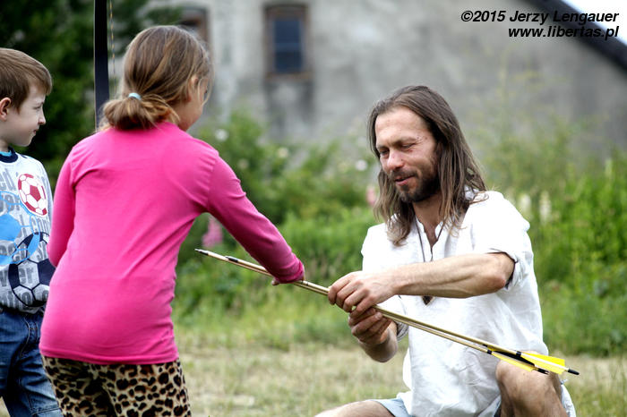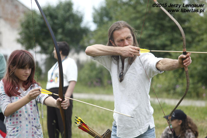 Nie, nie, to nie jest jakaś postać wyłaniająca się z mgieł snujących się nad mazurskimi bagnami. To nie żaden filmowy Robin Hood, wychodzący spośród gęstwiny drzew z powiewającymi na wietrze długimi włosami. Andrzeja Frankowskiego albo fotografa, albo łucznika, można zobaczyć choćby na rowerze, objuczonego właśnie aparatem fotograficznym, łukami i pojemnikiem na strzały, których strzec musi i dbać o nie w sposób niezwykły. Delikatne i cenne to instrumenty jego pasji, jego filozofii jego… propozycji dla najmłodszych, choć nie tylko. Swój świat ćwiczeń łuczniczych ma zdaje się gdzieś tam na Górce Poznańskiej, choć coraz trudniej znaleźć na niej odludne, ciche i w miarę czyste miejsce. Przytulony do innej znanej postaci kętrzyńskiego altruizmu, jeśli chodzi o najmłodszych, które się tam garną jak do najmilszej przedszkolanki (oczywiście mowa o Agnieszce Waraksie i jej Wakacjach w Siodle w Kątach), stara się, choć porusza się bez auta i liczy na uprzejmość rodziców dowożących swoje dzieci na jazdy konne, być i zafascynować starych bywalców i gości przygodnych Kątów łucznictwem. Ta sztuka w jego wykonaniu, choć posiadająca aspekt przede wszystkim filozoficzny, w jakiś niewytłumaczalny sposób przyciąga i wciąga. Momentalnie zaczynają się przy tym długowłosym i brodatym łuczniku-fotografie kręcić chłopcy i dziewczynki. Pada pomysł założenia szkółki łuczniczej, budowania wąwozie obok stajni Agnieszki miejsca do ćwiczeń. Andrzej kosi trawę, wycina krzewy, dzieci zbierają, grabią, pomagają. Plany mówią o strzelnicy z prawdziwego zdarzenia, o tarczach, o maskownicy, dzięki której niegubione byłyby cenne strzały, z delikatnymi lotkami, często wykonanymi własnoręcznie. Słynna już jest opowieść o poszukiwaniu jednej czy dwóch strzał w gęstwinie. Ot, skutki ćwiczeń…