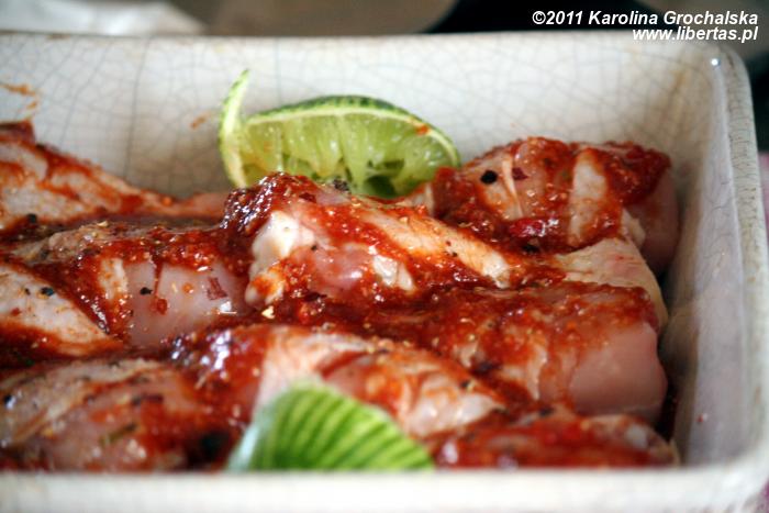 Pałki kurczaka ponacinać w kilku miejscach, ułożyć w naczyniu żaroodpornym i dokładnie pokryć marynatą. Ja dorzucam do mięsa wyciśnięte połówki limonki, bo lubię bardzo jej zapach i w trakcie pieczenia wypływa z niej jeszcze nieco soku. Przykryć folią aluminiową i odstawić do lodówki, najlepiej na noc/cały dzień lub minimum 2 godziny. Wyciągnąć z lodówki na pół godziny przed pieczeniem.