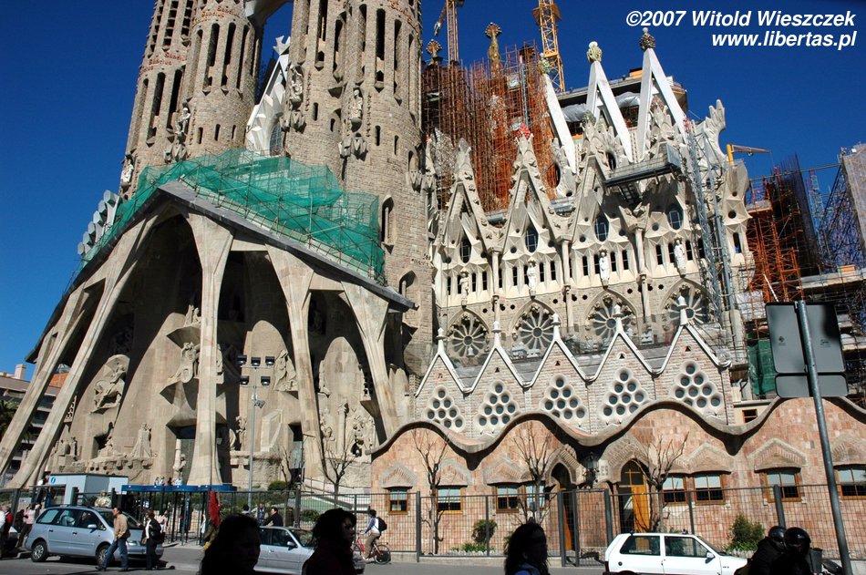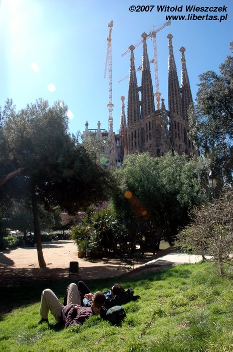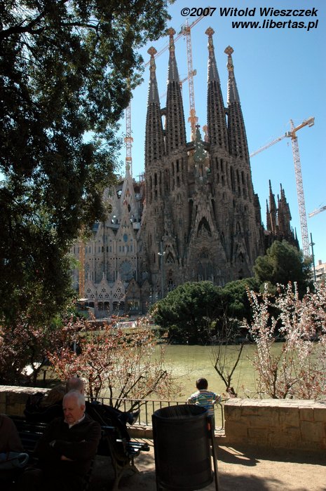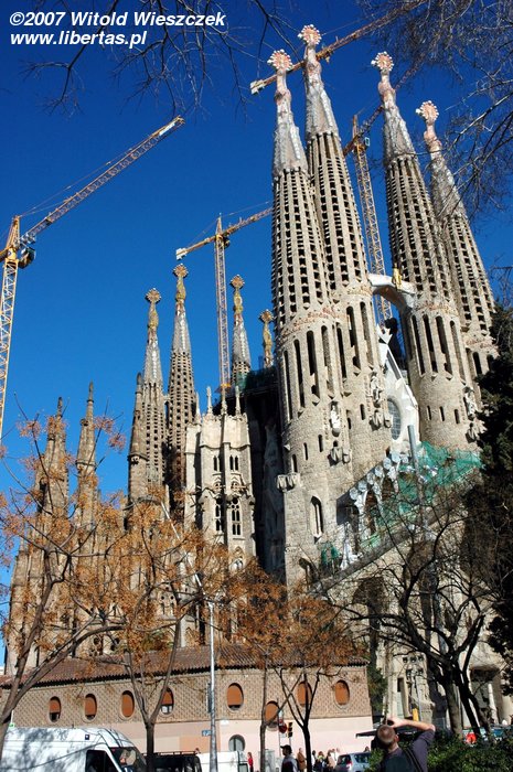 Plecaki zostawiliśmy w przechowalni bagażu na lotnisku (4,6€) i bez zbędnego balastu udaliśmy się autobusem (3,9€) do centrum, aby zobaczyć słynną bazylikę, której pełna nazwa po katalońsku brzmi: Temple Expiatori de la Sagrada Família. Budowę kościoła rozpoczęto w 1884 roku, więc jak łatwo policzyć prace trwają już ponad 100 lat! Nic dziwnego, zgodnie z zamysłem Antoniego Gaudíego konstrukcja budowli ma przypominać jeden, wielki organizm, a żaden detal nie może się powtarzać! Ta niepowtarzalność musi kosztować dużo czasu, nawet bardzo dużo!
