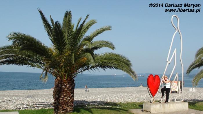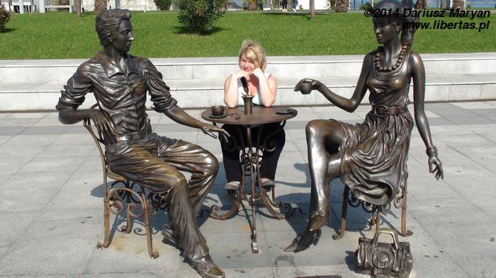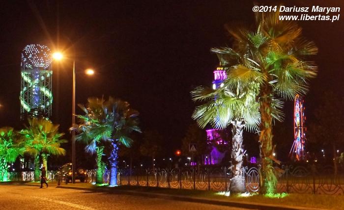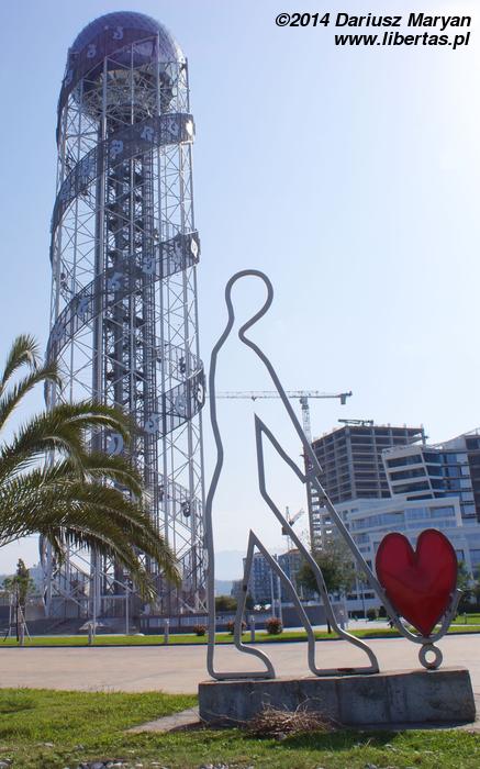 Idąc dalej, mijamy latarnię morską i diabelskie koło, wobec którego nie pozostaliśmy obojętni. Innymi atrakcjami są rzeźby, które można spotkać co kilkadziesiąt metrów. Z jednej strony promenady ciągnie się kamienista plaża, z drugiej pnące się w szybkim tempie w górę nowoczesne wieżowce. Fajna jest wieża alfabetu, która jednak nie jest ukończona. Po jej bokach spiralnie pną się do góry litery Gruzińskiego alfabetu, dumy narodowej.