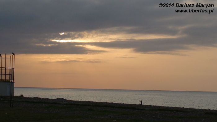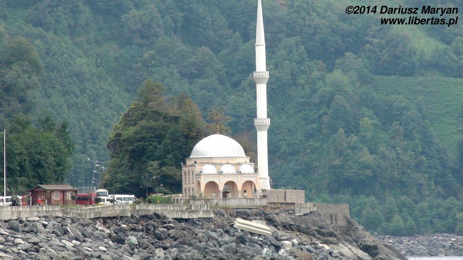Inną atrakcją Sarpi jest plaża, która podobnie jak w Batumi jest kamienista. Chcieliśmy chwilę na niej odpocząć i zrelaksować się w morzu, ale przejeżdżające tuż obok zastępy tirów, skutecznie psuły klimat. Dodatkowo pogoda wróciła do swojej Batumskiej normy. Nie padało, ale zrobiło się pochmurno. Po drugiej stronie granicy widać niewielki meczet, który wita wszystkich wjeżdżających do Turcji. Niejako dla równowagi po Gruzińskiej stronie stoi mała cerkiew. Zajrzeliśmy do środka – jest nijaka, strata czasu.