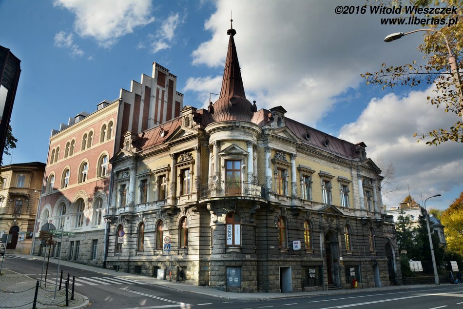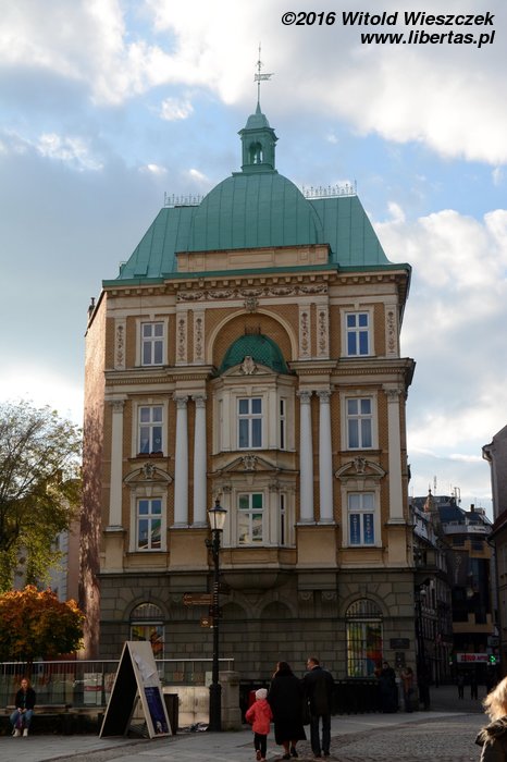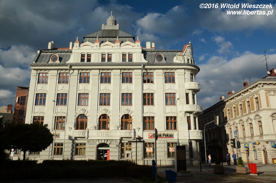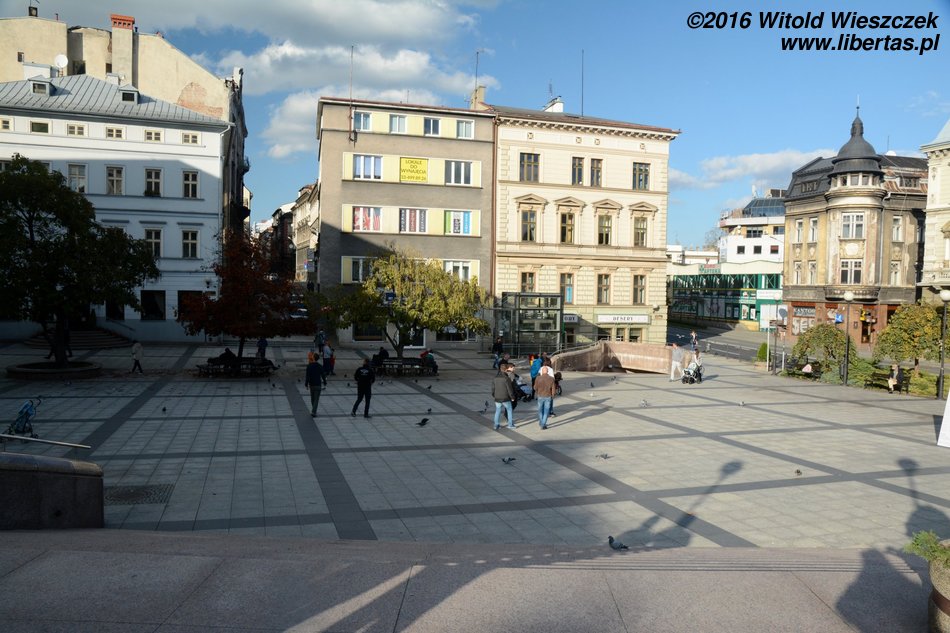 Cofamy się do świateł i przechodzimy na drugą stronę. Przed nami plac Bolesława Chrobrego, który powstał w połowie XIX wieku na skrzyżowaniu nowo powstałych głównych arterii komunikacyjnych miasta. Z czasem stał się właściwie głównym placem Bielska-Białej zastępując położony nieco wyżej Rynek Staromiejski. Znajduje się tu kilka ciekawych kamienic, w tym między innymi jednopiętrowa barokowa kamienica Karola Kałuży z drugiej połowy XVIII wieku