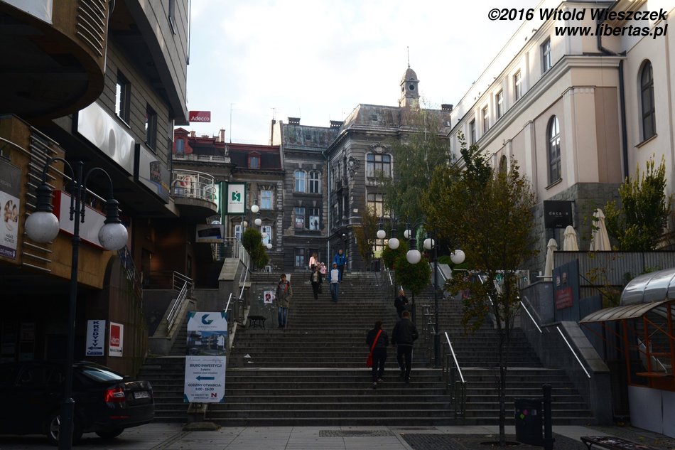 W kierunku zamku możemy wrócić ulicą 11 listopada (dawniej Wiedeńską), łączącą dawny rynek Białej z sąsiednim Bielskiem a będącą obecnie głównym deptakiem i centrum handlowym miasta. Jej początki sięgają połowy XVIII wieku. Była częścią Głównej Wiedeńskiej Drogi Handlowej, zwanej też Traktem Cesarskim, a łączącym Austrię z miastami Galicji, bo prowadzącym dalej przez Kraków, Przemyśl aż do Lwowa. Po drodze zobaczymy między innymi pomnik... Reksia, przypominający nam, że Bielsko-Biała była również ważnym miejscem na mapie polskiej animacji. To tutaj rysowano między innymi Reksia, Bolka i Lolka czy Baltazara Gąbkę...