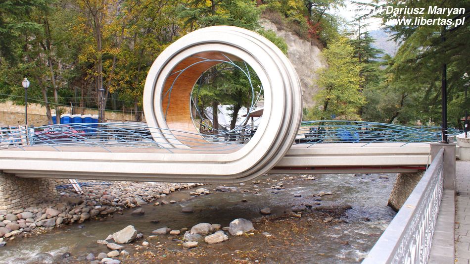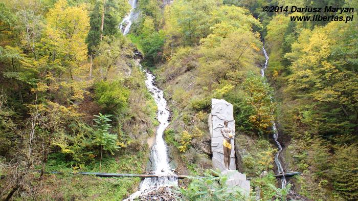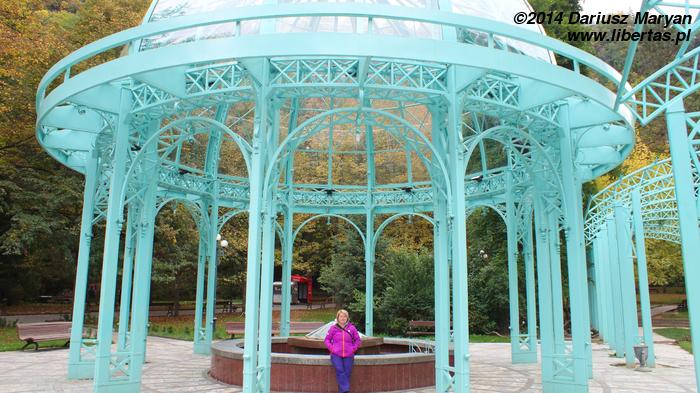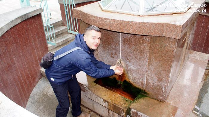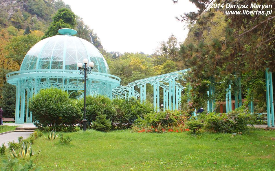 Pierwszym celem była słynna nie tylko w Gruzji miejscowość Bordżomi. Zasłynęła z doskonałej wody mineralnej, która właśnie tam jest pozyskiwana. Woda mineralna „Borjomi” różni się w smaku od innych dość mocno. Moim skromnym zdaniem jest nieco słonawa i smakuje jedynie, gdy mocno ją schłodzimy. Ciepła nie nadaje się do picia. A taka właśnie jest w Parku Zdrojowym w centrum miasta, który mięliśmy okazje zobaczyć. Poza naturalnymi ujęciami tej wody w parku jest kilka innych atrakcji, jednak po sezonie są one nieczynne. Warto zobaczyć wodospad, który spada po zboczu niewielkiego wzniesienia.