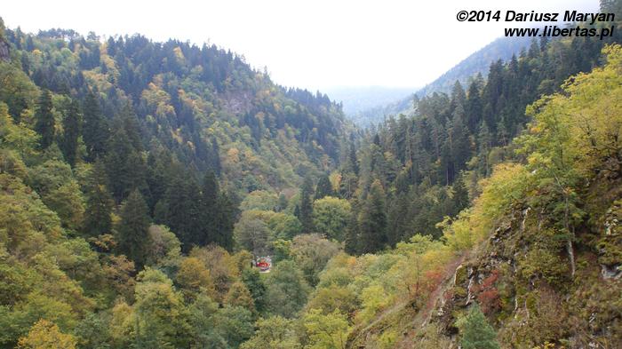 Należy w tym miejscu wspomnieć, że Bordżomi znajduje się w samym sercu Małego Kaukazu. Są to góry dużo niższe niż Kaukaz Wysoki. Przypominają nieco nasze Pieniny albo Małą Fatrę na Słowacji. Nie wiem, jak prezentują się latem, ale jesienią mienią się wspaniałymi kolorami. Wszędzie widać ruiny starych zamków czy kaniony wyżłobione przez rwące rzeki. Okolica jest bardzo piękna i stanowi cześć Parku Narodowego.