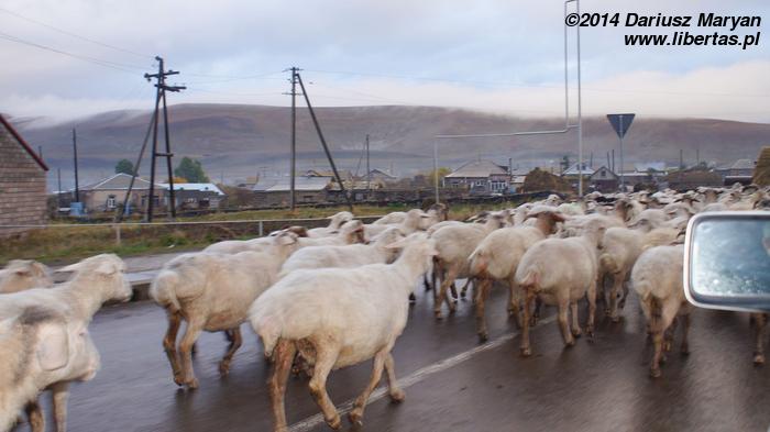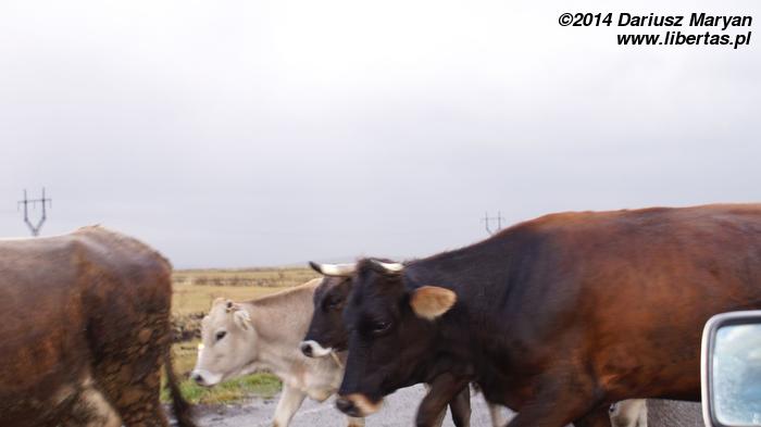Wracaliśmy inna drogą niż przyjechaliśmy, dzięki temu mogliśmy zobaczyć kolejne atrakcje południowej Gruzji. Pierwszą bez wątpienia była wioska Ninotsminda. W samej wiosce nie było nic ciekawego, natomiast interesujący był przemarsz krów z pastwisk do swoich zagród. Takiej ilości bydła to nigdy w życiu nie widzieliśmy. Nad drogowym chaosem próbował zapanować opiekun stada dosiadający konia. Szło to jednak opornie, gdyż krowy były mało zdyscyplinowane i co chwila rozłaziły się na wszystkie strony. Krowi korek trwał dobre dwadzieścia minut. Gdybyśmy mieli wiaderko i odpowiednie umiejętności to z samochodu spokojnie moglibyśmy zorganizować mleko pierwszej świeżości.