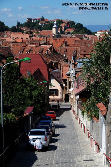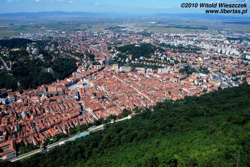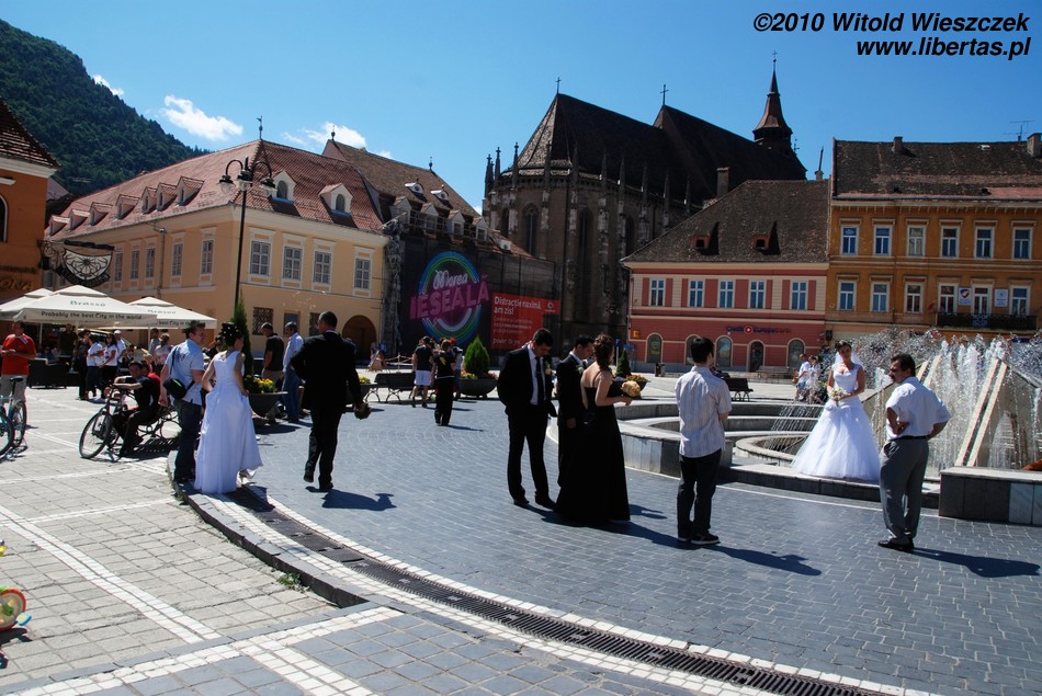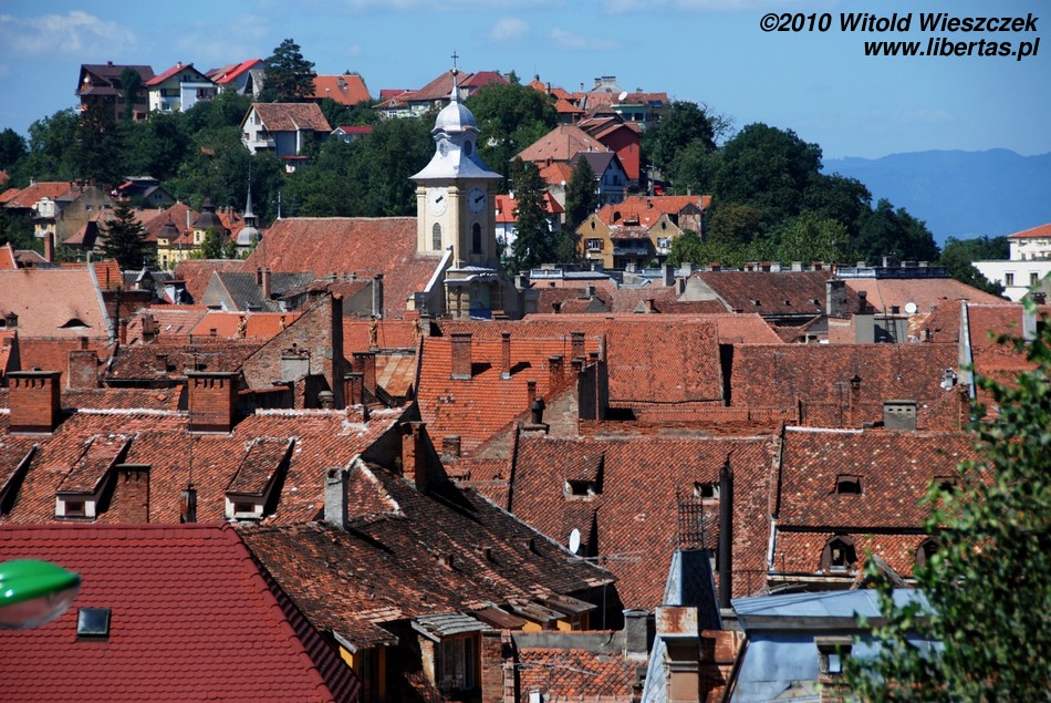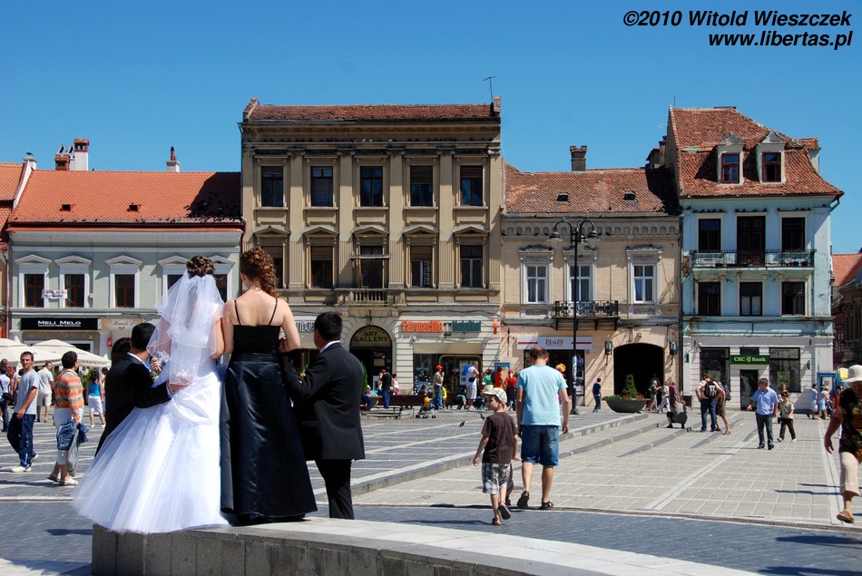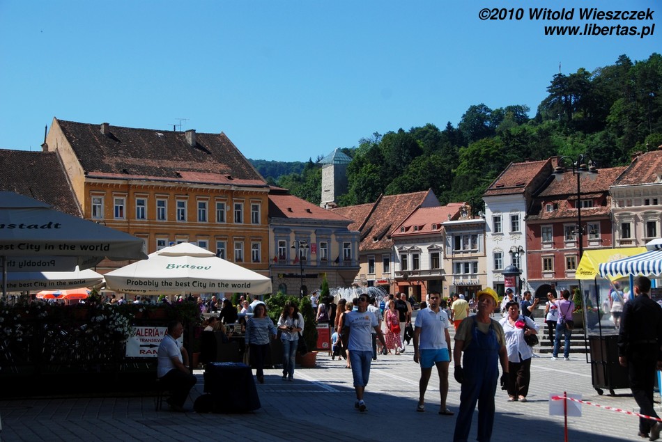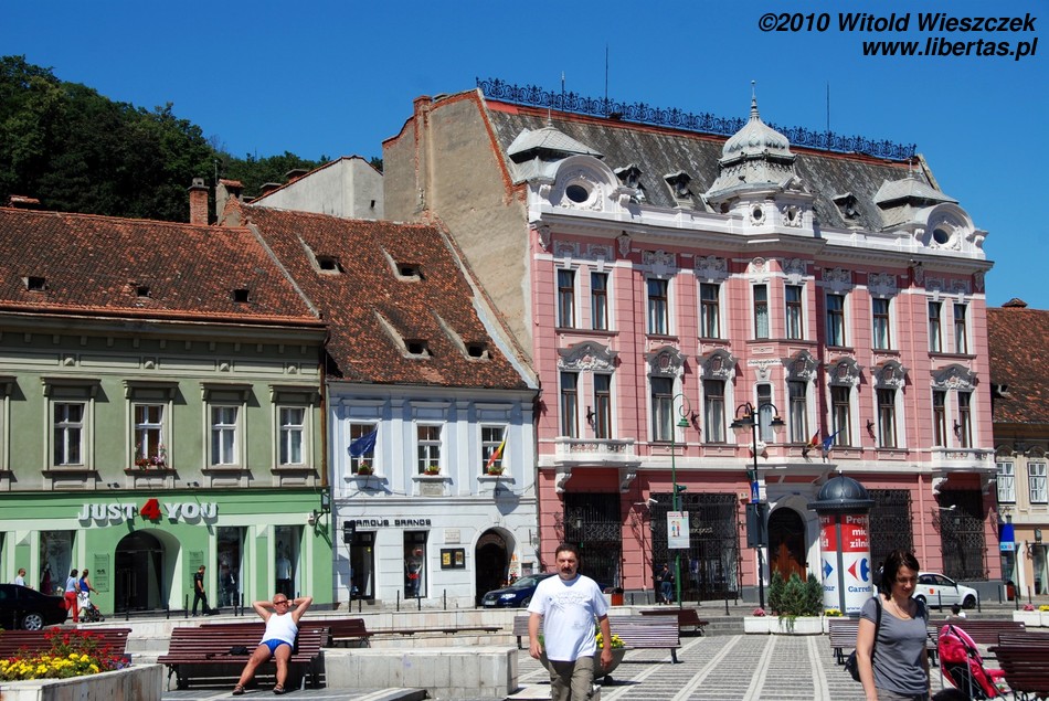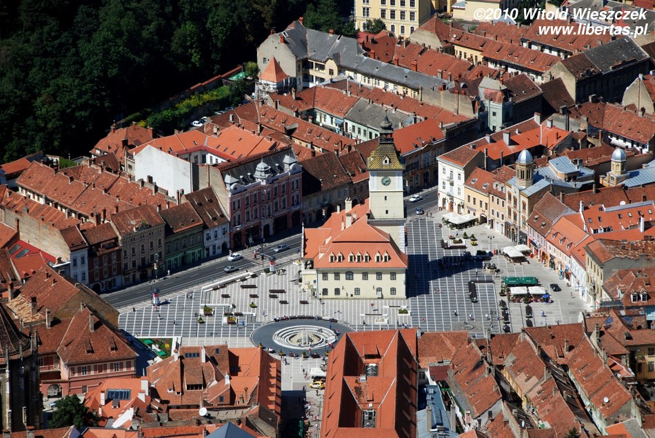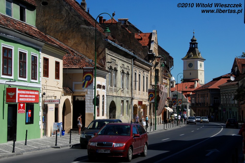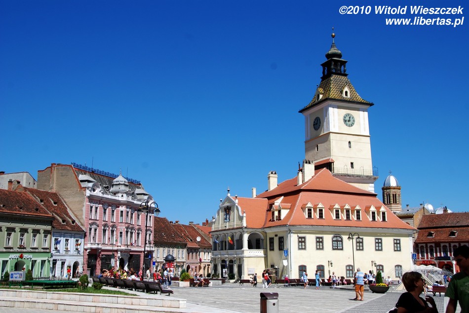 Miasto jest bardzo dobrze oznakowane, więc bez najmniejszego problemu, a wręcz z rzadko doświadczaną w takich sytuacjach przyjemnością, każdy powinien znaleźć drogę na starówkę. Na głównym placu – Piaţa Sfatului – zobaczymy zabytkowy, późnogotycki ratusz z 1420 roku i przylegającą do niego 58-metrową wieżę strażniczą z 1528 roku. Plac okalają bardzo ładne kamieniczki reprezentujące różne style architektoniczne.
