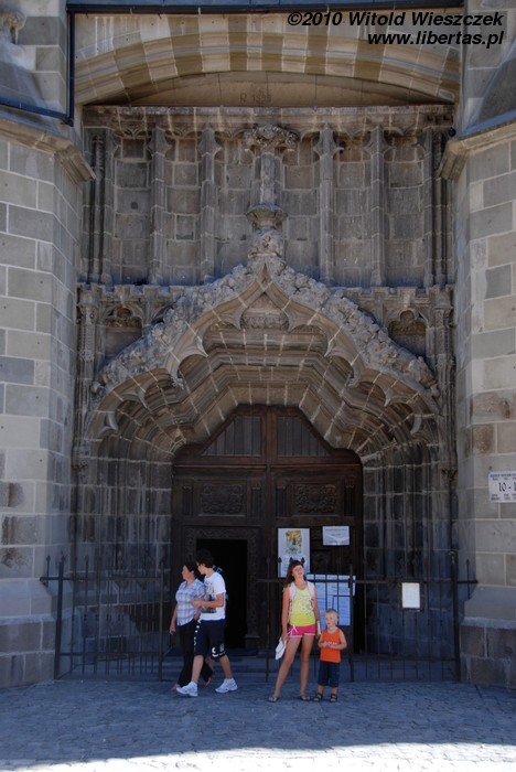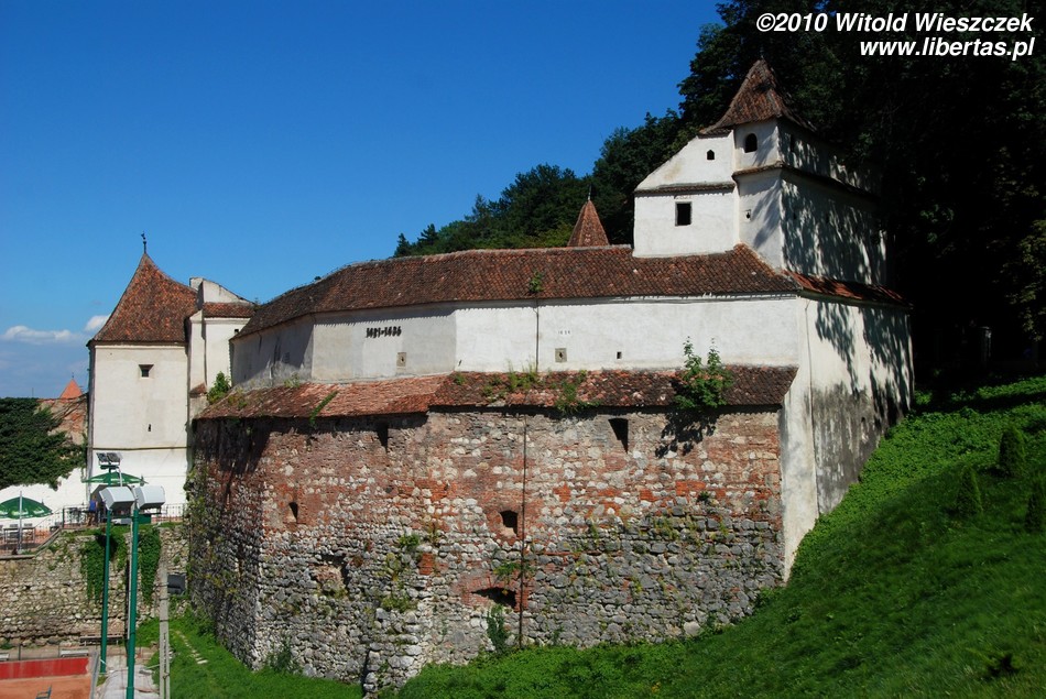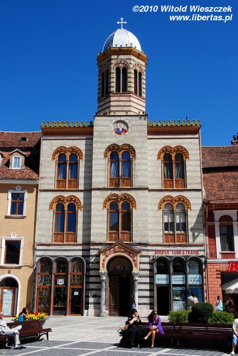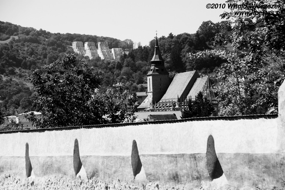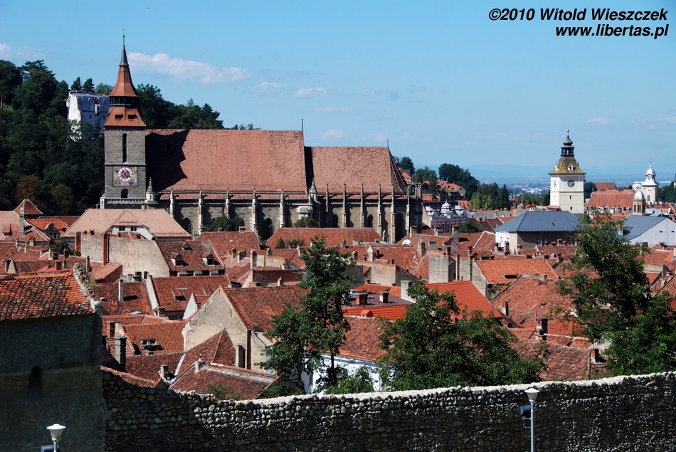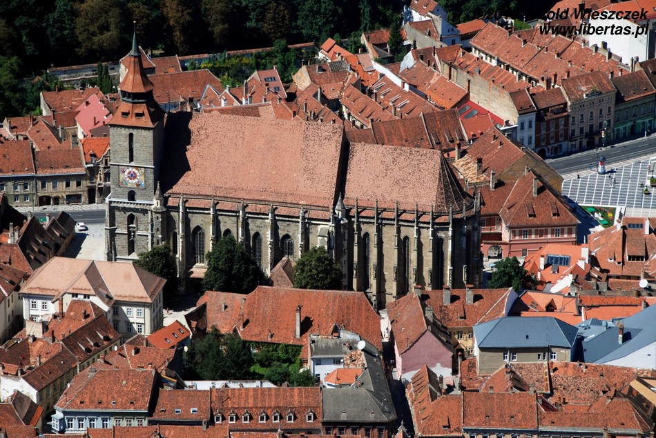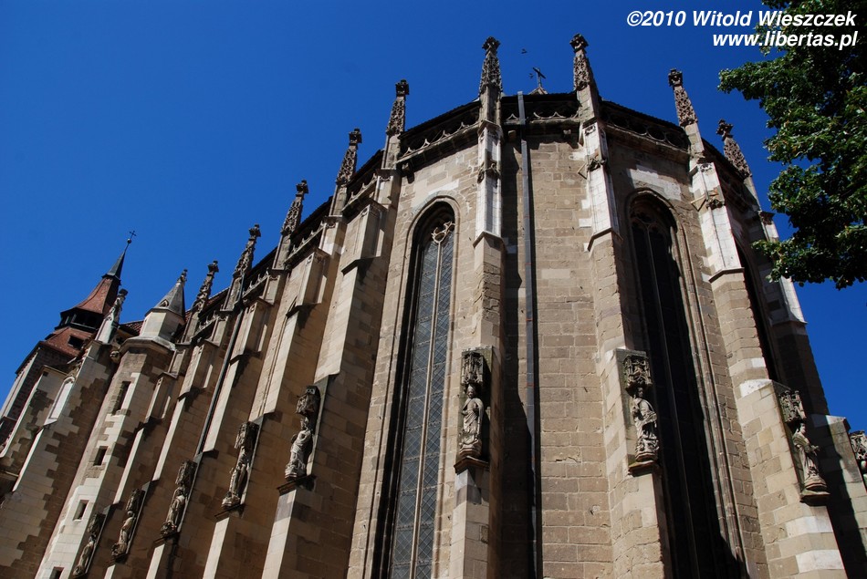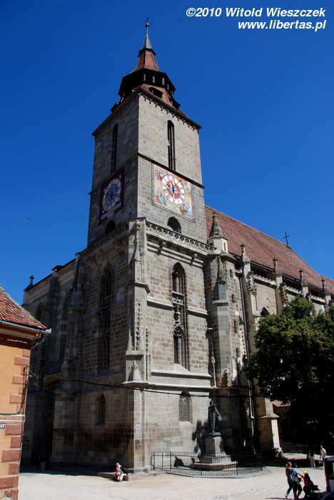 Będąc na Piaţa Sfatului trudno nie zauważyć masywnej sylwetki Czarnego Kościoła. Budowę rozpoczęto w roku 1383 w miejscu, gdzie stał poprzedni kościół zniszczony podczas inwazji mongolskiej w 1242 roku. Miejsce chyba nie było szczęśliwe, bo niestety w 1421, gdy prace dobiegały już końca, miasto najechali Turcy powodując poważne szkody. Gdy zagrożenie minęło wznowiono budowę i kościół został konsekrowany w roku 1477. W planach były dwie wieże, jednak ostatecznie wybudowano tylko jedną, w roku 1514.