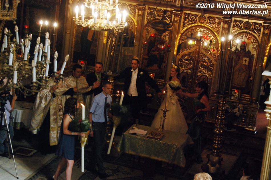 Ksiądz usłyszał nasze głosy, jak zbliżaliśmy się, i czekał na nas przy drzwiach cerkwi, ściskając w dłoniach Świętą Księgę, a słońce błyszczało i migotało na jego pięknym złotym ornacie. (...) Nasze małe ślubne towarzystwo szło razem ścieżką przez łąkę do drzwi cerkwi, na spotkanie z księdzem. Wyciągnął Księgę przed nas; pocałowaliśmy ją z czcią, a następnie podążyliśmy za nim, kiedy odwrócił się i wszedł do środka, idąc wolno i uroczyście do centrum kościoła, gdzie umieszczono stół. W prawosławnej cerkwi nie ma ławek. Modlący się stoją, bądź klęczą, czasem całe msze trwające godzinami w wielkich cerkwiach. Ani też, w przeciwieństwie do zachodnich kościołów, śluby nie są odprawiane przed ołtarzem. Stół w centralnym punkcie cerkwi przykryty był do podłogi wielkim fioletowo-złotym brokatem, będącym częścią szat liturgicznych, w jakie moja matka wyposażyła tę małą cerkiew, kiedy przywiozła ją do Branu. Ksiądz położył Biblię na stole. Był tam też krzyż, i mała taca, a na niej dwie ślubne obrączki, kielich z winem ze srebrnym talerzem, zawierającym dwa lub trzy niewielkie bochenki chleba, i, najważniejsze, dwie złote korony. Goście weselni stali, jak przystało, obok stołu w szacownej odległości. Anna i Iosef stali razem blisko stołu zwróceni twarzą w kierunku ołtarza. Anton stał obok Iosefa, a ja obok Anny. Anton i ja trzymaliśmy zapalone świece. Ksiądz stanął naprzeciw nas i rozpoczęła się ceremonia zaślubin. Po modlitwach ksiądz podniósł jedną z obrączek ze stołu i dotknął nią czoła Iosefa, mówiąc, „Sługa Boży, Iosef, jest przyrzeczony służebnicy Bożej, Annie.” - To powtórzywszy dwa razy, umieścił obrączkę na lewej dłoni Iosefa. Następnie zwrócił się ku Annie i, biorąc drugą obrączkę, z kolei dotknął nią jej czoła. „Służebnica Boża, Anna, jest przyrzeczona słudze Bożemu, Iosefowi.” - Wyrecytował, powtarzając to dwa razy. Po tym, zgodnie z prastarym rytuałem, zgasiłam swoją świecę i wymieniłam obrączki, zakładając obrączkę Iosefa na palec Anny, a Anny na Iosefa, czyniąc każdą znak krzyża, kiedy to robiłam. Następnie wróciłam na swoje miejsce przy stole i znów podniosłam świecę. Anna i Iosef złączyli ręce. Wtedy ksiądz uroczyście uniósł jedną ze złotych koron w swoich dłoniach i dotknął nią czoła Iosefa. „Sługa Boży, Iosef, jest zaślubiony służebnicy Bożej, Annie.” - Wypowiedział ksiądz trzy razy, i z pomocą Antona umieścił ją na czole Iosefa. Uniósł drugą koronę i dotknął nią czoła Anny. „Służebnica Boża, Anna, jest zaślubiona słudze Bożemu, Iosefowi.” - Ogłosił ksiądz trzy razy, i z kolei ja pomogłam mu umieścić ją na pochylonej głowie Anny, nad jej ślubnym welonem tak, że spoczęła na poskręcanej beteali. To ukoronowanie było wielką chwilą ceremonii, symbolicznie, była to chwila wieńcząca ich życie. Następnie panna młoda i pan młody powoli i z godnością obeszli trzy razy stół dookoła, symboliczny taniec radości; jego źródła sięgają daleko w przeszłość, wręcz do Starego Testamentu. Zakończywszy koronowanie, ksiądz uniósł kielich i dał Iosefowi i Annie po łyku wina, a oni, wciąż nosząc swoje złote korony, podzielili się chlebem, jednym z tych na srebrnym talerzyku. Ta część ceremonii zaślubin jest odprawiana na pamiątkę wesela w Kanie Galilejskiej, gdzie Chrystus, który jest naszym Najwyższym Kapłanem, dokonał pierwszego cudu w swojej posłudze, ten przemienienia wody w wino, kiedy Jego matka szepnęła Mu, że wino podane przez gospodarza wyczerpało się. Jest to również symbol pierwszego wspólnego posiłku pary w ich małżeńskim stanie. Następnie korony zostały usunięte przez księdza z pomocą druhny i drużby, ucałowane z czcią przez naszą czwórkę i złożone na przykrytym brokatem stole. W końcu, po trwających bez końca modlitwach, ksiądz ogłosił ich mężem i żoną i pobłogosławił ich znakiem krzyża. Od razu nastąpiła wielka radość pośród gości. Otoczyli młodą parę, podając im ręce i całując ich, obejmując i gratulując im.