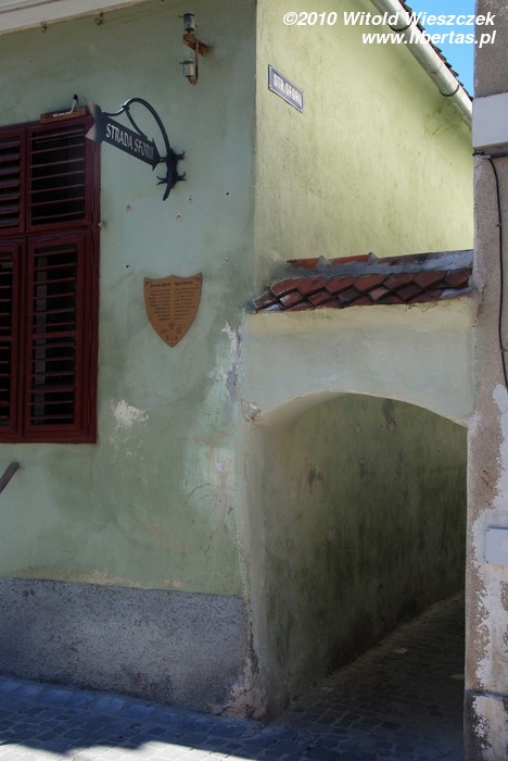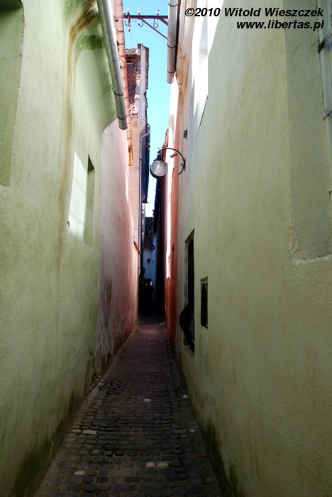 Kierując się od kościoła na południe dochodzimy do ulicy Poarta Schei i skręcamy w prawo, na południowy zachód. Mniej więcej na wysokości Czarnego Kościoła powinniśmy znaleźć odbijającą w lewo słynną uliczkę Sznurową (strada Sforii). Jest to najwęższa uliczka w Europie o szerokości zaledwie 1,32 metra i długości 83 metrów! Jest tak wąska, że wygląda właściwie bardziej jak brama, więc musicie uważać, żeby jej nie przeoczyć. Idąc dalej mijamy po lewej stronie synagogę z 1901 roku i opuszczamy średniowieczne centrum miasta przechodząc przez klasycystyczną bramę z 1827 roku zbudowaną w formie łuku triumfalnego.