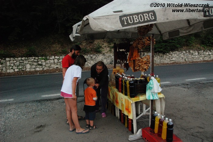 Przejazd można sobie dodatkowo urozmaicić próbując różnych miejscowych specjałów, dodajmy, że póki co niezbadanych jeszcze przez unijnych urzędników i nie spełniających żadnych mniej lub bardziej idiotycznych norm. Może dlatego smakują znacznie lepiej! My kupiliśmy sobie trochę kiełbasek z niedźwiedzia i z dzika, były bardzo dobrze uwędzone i piekielnie smaczne! Po szybko zorganizowanej i zupełnie niehigienicznej degustacji kupiliśmy jeszcze dwie półtoralitrowe butelki pysznych domowych soków i wiązkę precli. I nie uwierzycie Państwo, ale żyjemy! Naprawdę!