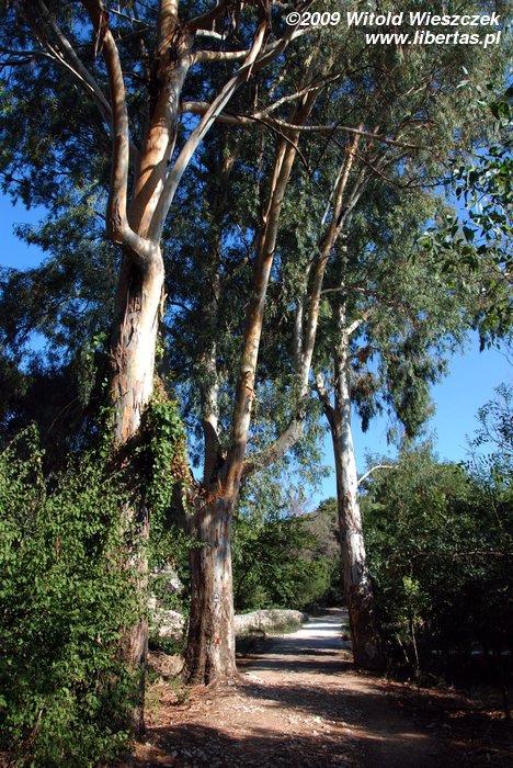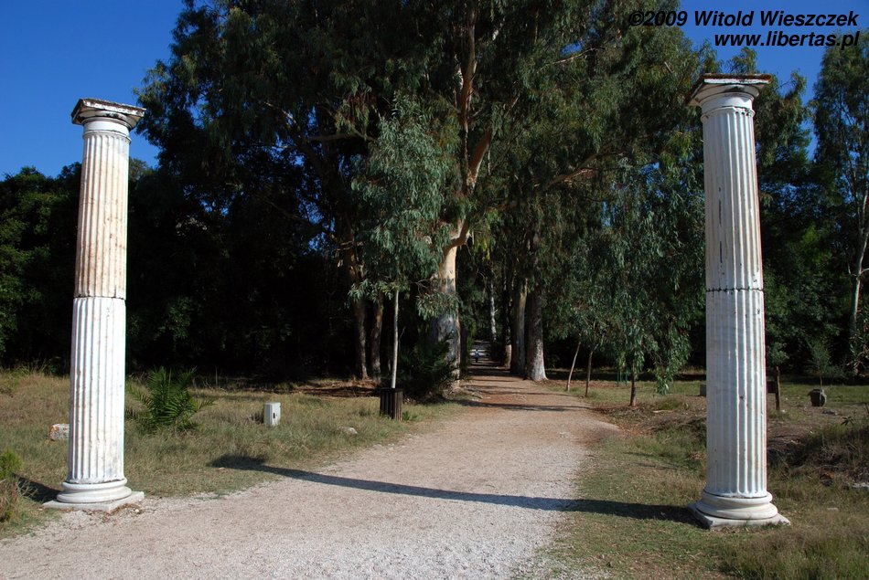 Nearby the tower, 2.5 m thick defensive city walls of huge limestone blocks have their beginning. We don’t go this way. We move back to the front of the tower and go to the north to the agora. At the beginning of our alley there are two columns.