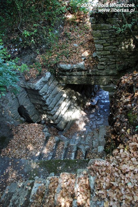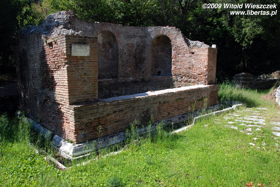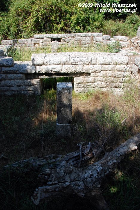 Walking further we pass by the nymphaeum - a fountain built for the water nymphs in form of a temple with apses. It was built in the 1st or 2nd c. when the aqueduct was erected. After looking around we can notice its remains - foundations and abutments.