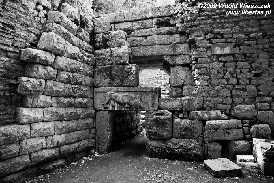Walking further along the walls we can get to the next gate with a distinctive relief of a lion devouring a bull head. The gate took its name from the relief - the Lion Gate. It is 3.5 m high and ideally preserved. It is dated on 380-350 BC, but the block with the relief on it wasn’t its part since the beginning - it was added in c. the 5th c. in order to make the passage smaller and to ease defence. After passing the gate, we can notice on the right side in an alcove the modest nymphaeum. It was funded in the 2nd c. by Junia Rufina - a friend of nymphs, which is proved in the inscription: ΙΟΥΝΙΑ ΡΟΥΦΕΙΝΑ ΝΥΜΦΩΝ ΦΙΛΗ.