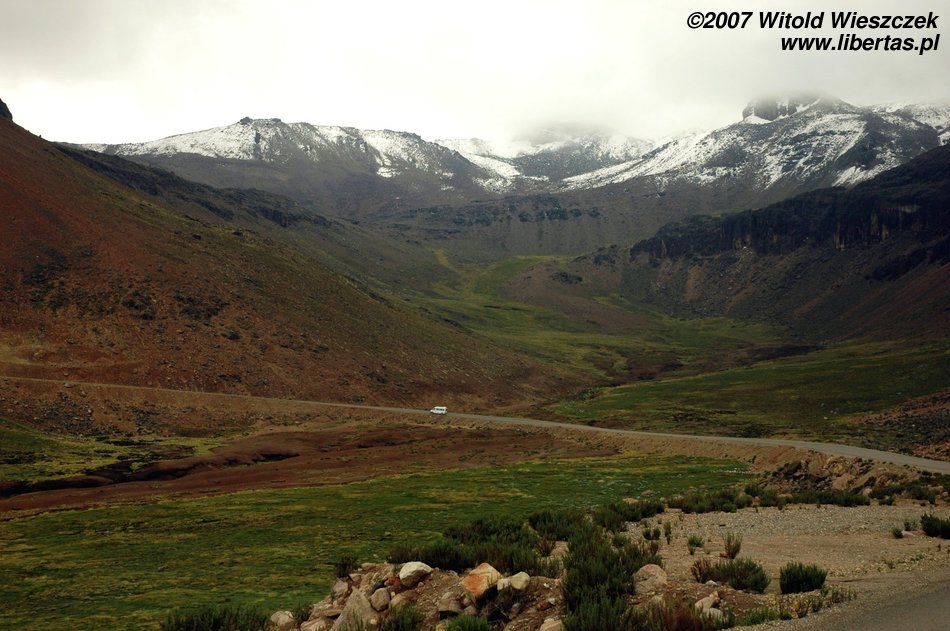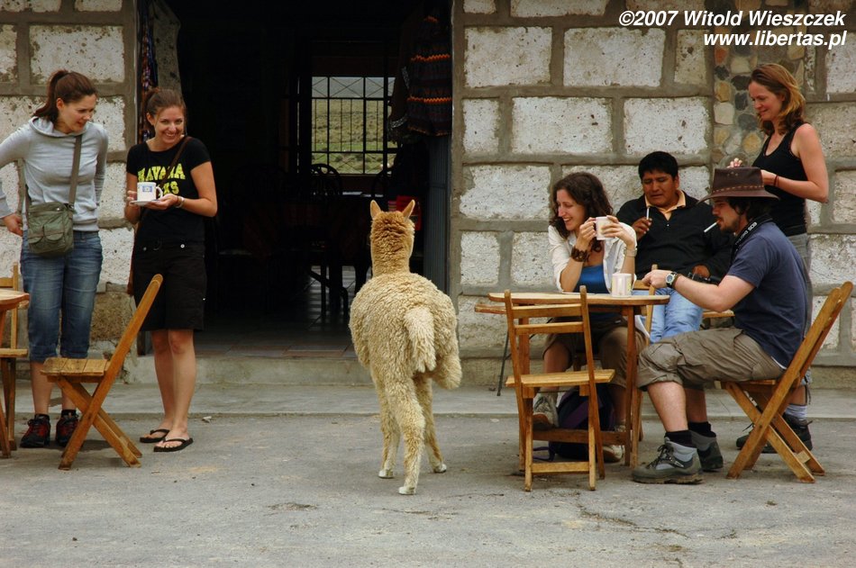 Arequipa jest położona na wysokości 2398 metrów, dzisiaj dotrzemy do Chivay (3650 m n.p.m.), pokonując po drodze Przełęcz Wiatrów położoną na wysokości 4950m n.p.m. Po drodze odwiedzamy indiańską wioskę, gdzie można napić się mate de coca, a także zakupić jakiś sweter albo czapkę z bardzo ciepłej wełny Alpaki. Odwiedza nas też bardzo towarzyska lama, która rozbawia całe towarzystwo.