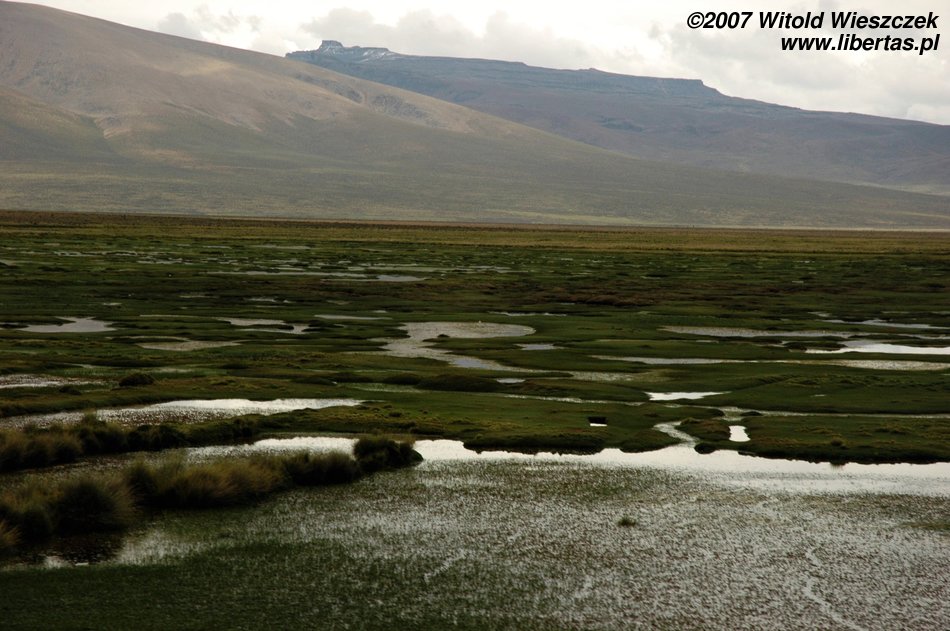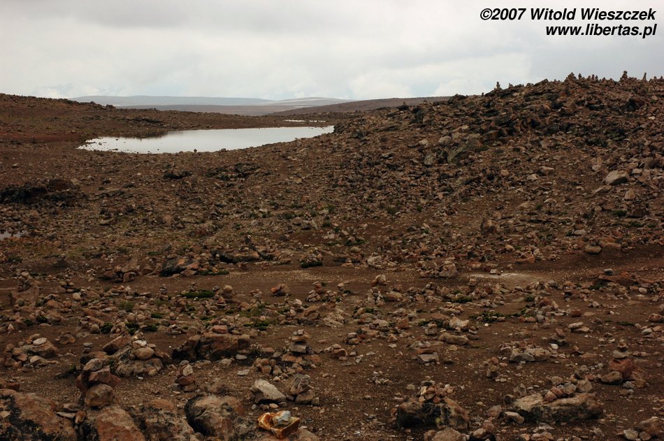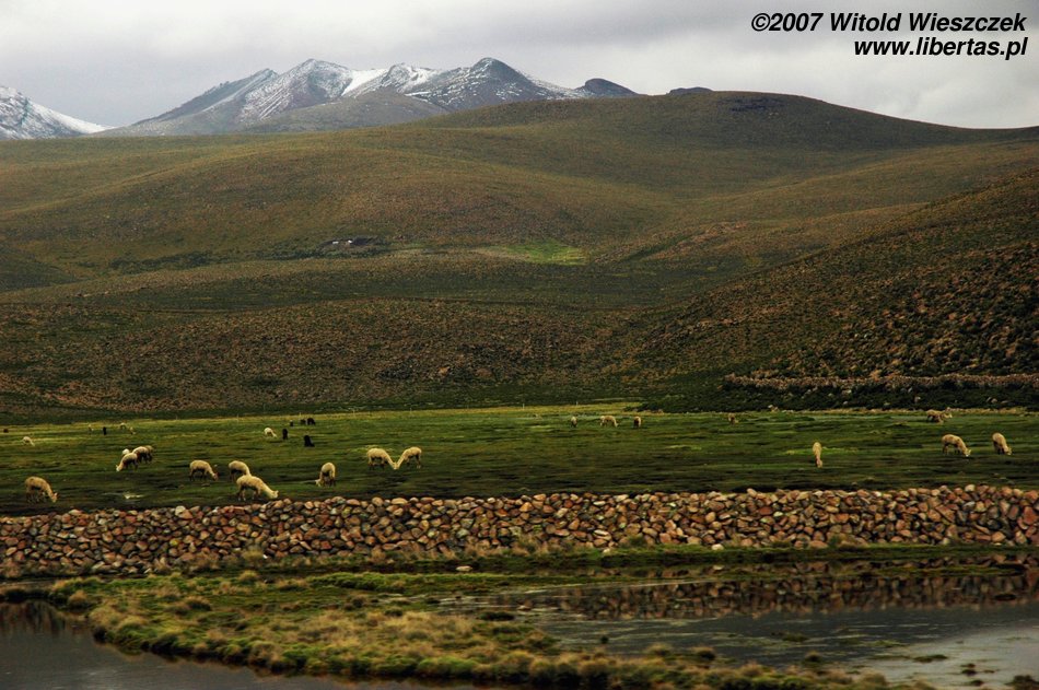 Później robi się zielono i pojawiają się lamy. Kiedy po raz któryś zatrzymujemy się podziwiać widoki, zdaję sobie sprawę, że chyba mam chorobę wysokościową i liście koki tylko trochę łagodzą jej objawy. Docieramy na przełęcz wiatrów położoną na wysokości prawie 5000 metrów. Dookoła obficie wyrastają apachety. Każdy może taką zbudować z otaczających kamieni i złożyć w niej coś w ofierze dla Pachamamy – Matki Ziemi. Najczęściej składa się jej w ofierze to, co tutaj najcenniejsze, czyli liście koki. Budując, można się modlić do Pachamamy w jakiejś intencji, albo jak mówią gringos, mięć jakieś życzenie.