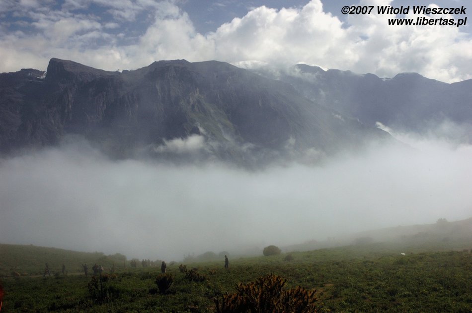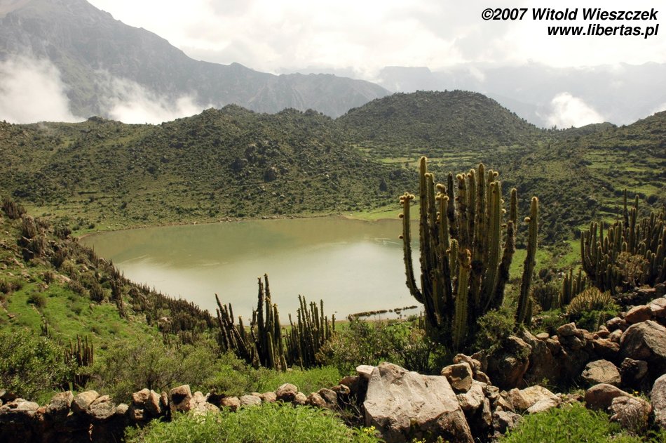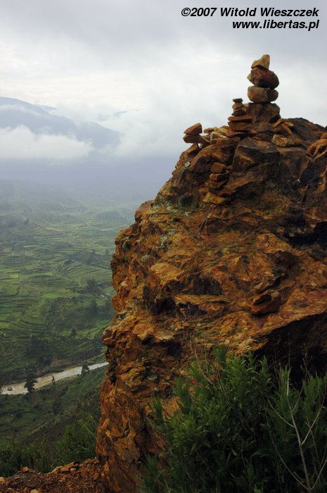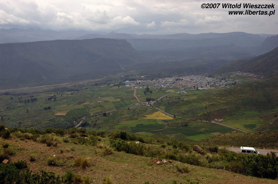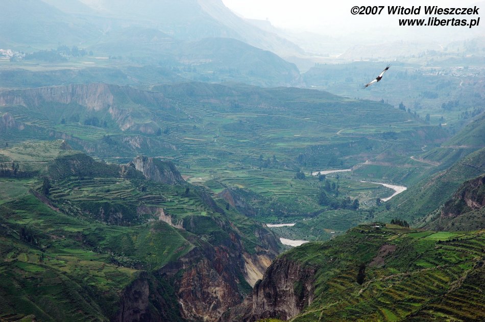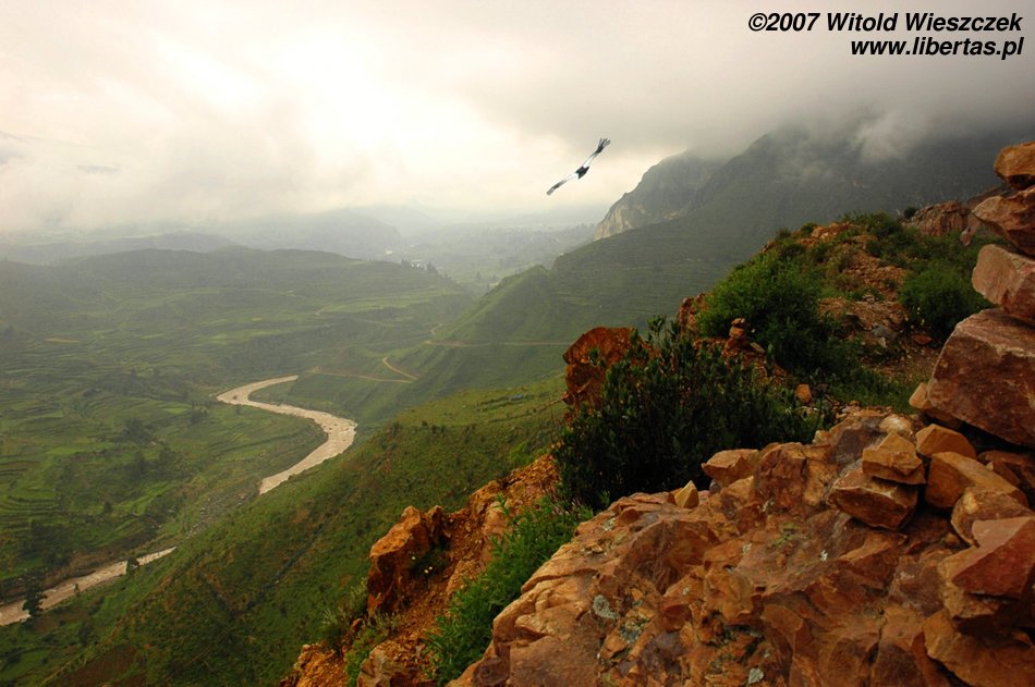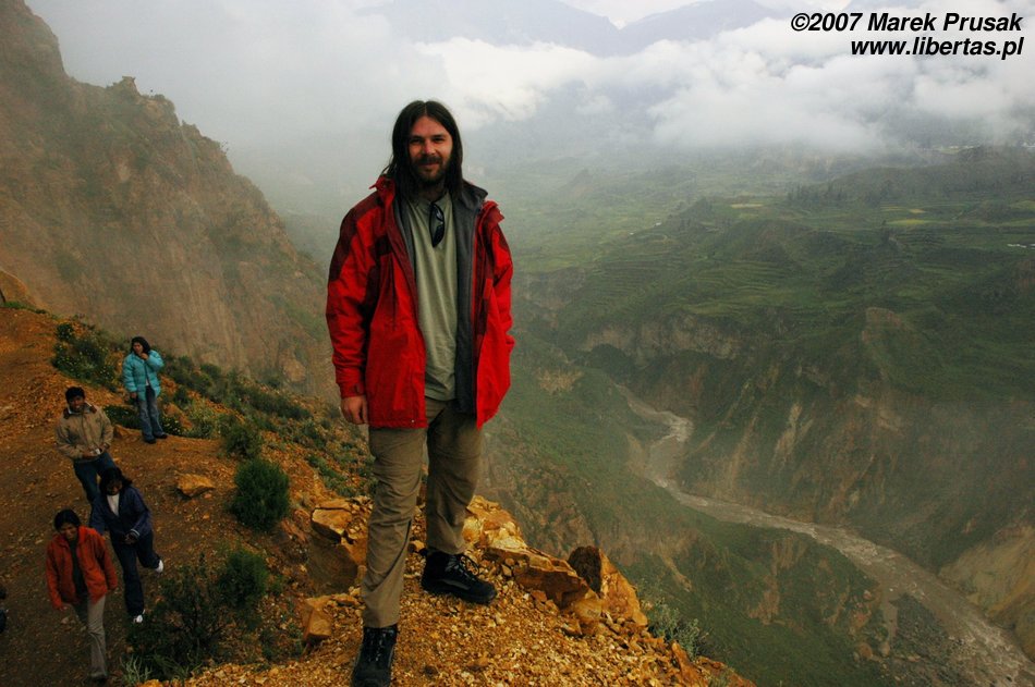 Tak było właśnie w najważniejszym miejscu. Cruz del Condor zawdzięcza swoją nazwę unoszącym się w tym miejscu na prądach ciepłego powietrza olbrzymim kondorom, których rozpiętość skrzydeł osiąga czasem nawet trzy metry! Ptaki te robiły wielkie wrażenie już na Inkach, którzy wybrali je sobie na swój symbol. Niestety my nie zobaczyliśmy tutaj ani kondorów ani, co gorsza, kanionu. Jest on dużo węższy i ponad dwukrotnie głębszy od Wielkiego Kanionu Kolorado w USA. Co ciekawe został odkryty przez Polaków, którzy jako pierwsi w 1979 roku „ujarzmili” rzekę i zdobyli kanion! Następnym razem koniecznie muszę sobie zarezerwować w tym miejscu więcej czasu i poświęcić dzień, aby zejść na dół! Kondory zobaczyliśmy w innym miejscu...