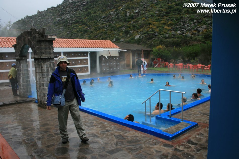 Chivay wita nas przebranymi lamami i bramą powitalną. W Keczua (języku Inków) Chivay oznacza miłość, wjeżdżamy więc do miasta miłości. Ale miłość wszędzie kosztuje, płacimy za wjazd do parku 35 soli od osoby. Wieczorem jedziemy nad gorące źródła La Calera, bogate w wapń i żelazo wody wypływając z ziemi, mają temperaturę 85°C. Jest bosko! Spotykamy tu grupę Polaków, którzy wykupili wycieczkę w biurze podróży. Za 18 dni zapłacili mniej więcej tyle, ile my wydamy tutaj przez całe 5,5 tygodnia!