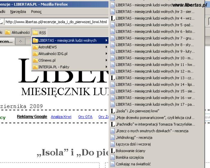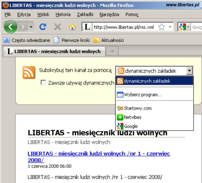 Co jeszcze jest nam potrzebne by subskrybować kanał RSS? A no adres URL tego kanału. Adres kanału RSS miesięcznika Libertas ma postać: http://www.libertas.pl/rss.xml - to tego adresu używamy w ustawieniach czytników RSS, o czym dalej.