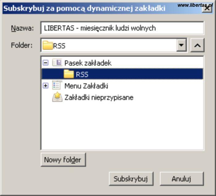 Wybieramy folder w którym ma pojawić się kanał. Ja nie chcę sobie śmiecić na pasku zadań więc kliknąłem na ten przycisk ze strzałką w dół i w „Pasku zakładek” utworzyłem sobie nowy folder o nazwie „RSS” po czym wybrałem go jako folder do którego ma być subskrybowany kanał RSS i kliknąłem „Subskrybuj”.