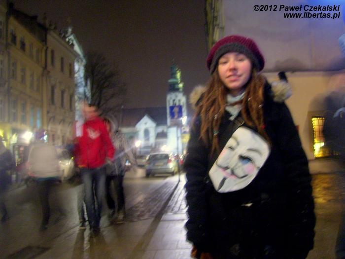 Przez Kingę zostałem wciągnięty w akcję zbierania podpisów w sprawie referendum o wprowadzeniu ACTA. Na początku miałem jeden długopis, potem, jak ludzie zaczepieni na ulicy zaczęli podpisywać(ok.90% chciało), pytałem czy ktoś ma coś do pisania , żeby było szybciej pisać na innych listach. W końcu piszący jechali na cztery długopisy, tworzyły się niewielkie kolejki, ludzie podpisywali kartki oparci o szyby wystawowe jakiegoś luksusowego sklepu. Zacząłem się zastanawiać co na to sprzedawcy, że im tak ludzie oblepiają sobą szyby. W pewnym momencie wyszła modnie ubrana sprzedawczyni i sama się podpisała na liście. Z radością.