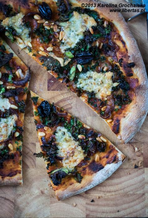 Z założenia – placek biedaków, teoretycznie – zniesie wszystko. I ja jestem zwolennikiem eksperymentów z pizzą, choć największym sentymentem darzę prostą Margheritę z sosem ze świeżych pomidorów. Mimo to u mnie na stole gościła już pizza z rozmarynem i ziemniakami, wcale nie czerwona, ale biała (pizza bianca). Makrela, buraki i chrzan wydają się Wam zbytnią ekstrawagancją na pizzy? Nie dla mnie! Kozi ser i szparagi to majowa klasyka u nas w domu, w październiku króluje pizza z dynią i orzeszkami pinii. Jarmuż i kasztany też zaliczyłam, a co! Wiecie, czym mnie można przestraszyć? Pizzą przykrytą toną wyrobu seropodobnego albo warzywami z puszki. Uciekam z krzykiem, gdzie pieprz rośnie. Jesteście otwarci na eksperymenty z pizzą? To zapraszam na mój dzisiejszy wynalazek – pizzę z jarmużem, owczym serem i oliwkami. Podane proporcje są na 3 średnie pizze, ciasto jest z tych cieńszych.