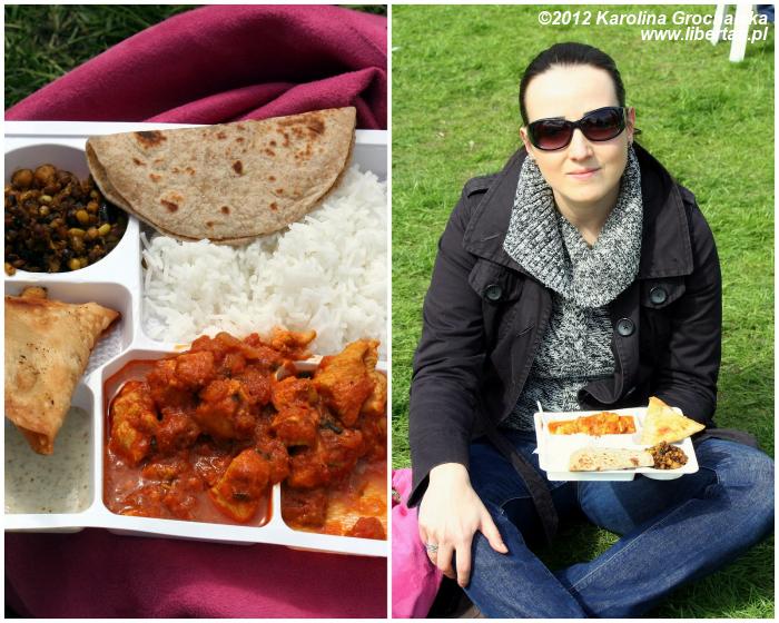 Czas na zasłużony lunch. Na tacce mam zestaw, który ugotowała Prett Tejura, na której prezentacji z trzech dań kuchni indyjskiej byłam dzień wcześniej. Prowadzi ona kursy kulinarne w Leeds, gotuje kolacje u klientów w domu, a także sprzedaje swoje domowe przetwory. Cud, miód i orzeszki. I niech Was nie zmyli mój ubiór - w pierwszy majowy weekend mieliśmy 5–8°C!