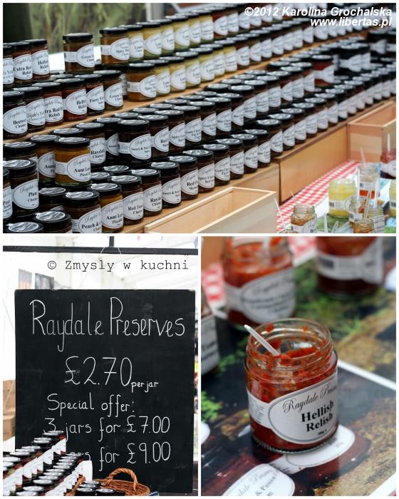 Frere Quenelle Liqueurs – nie lada gratka dla wielbicieli likierów – bez konserwantów i innych głupich składników, jak zapewniał mnie mnich(?). Raydale Preserves, czyli co kupuję, gdy skończą mi się domowe chutneye. Produkowane w zaadaptowanej do tego celu starej stodole w Askrigg przez jedną rodzinę od 1978 roku. Bez chemicznych dodatków, bez środków żelujących. Bruschetty kocham miłością wielką. Jedno ze stoisk proponowało niezły ich wybór. No, umówmy się, to nie jest typowe jedzenie z Yorkshire, ale za to pyszne. Zresztą na festiwalu było też stoisko z wyrobami włoskimi.