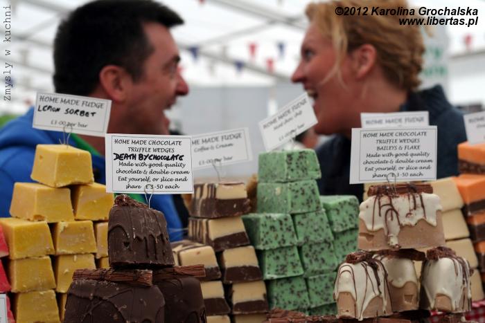 Słodkości, słodkości – mdliło mnie od samego patrzenia! Pokazuję dla równowagi – wszak nie tylko serami i mięsiwem człowiek żyje! Zobaczcie entuzjazm na ich twarzach! Mam nadzieję, że tyle samo pozytywnej energii wkładają w swoje słodycze. Na zdjęciach fudge – czyli coś trochę podobnego do naszych krówek. Jest to jednak masa dużo bardziej kleista i zwarta w przeciwieństwie do naszych krówek czy to kruchych, czy ciągutek.