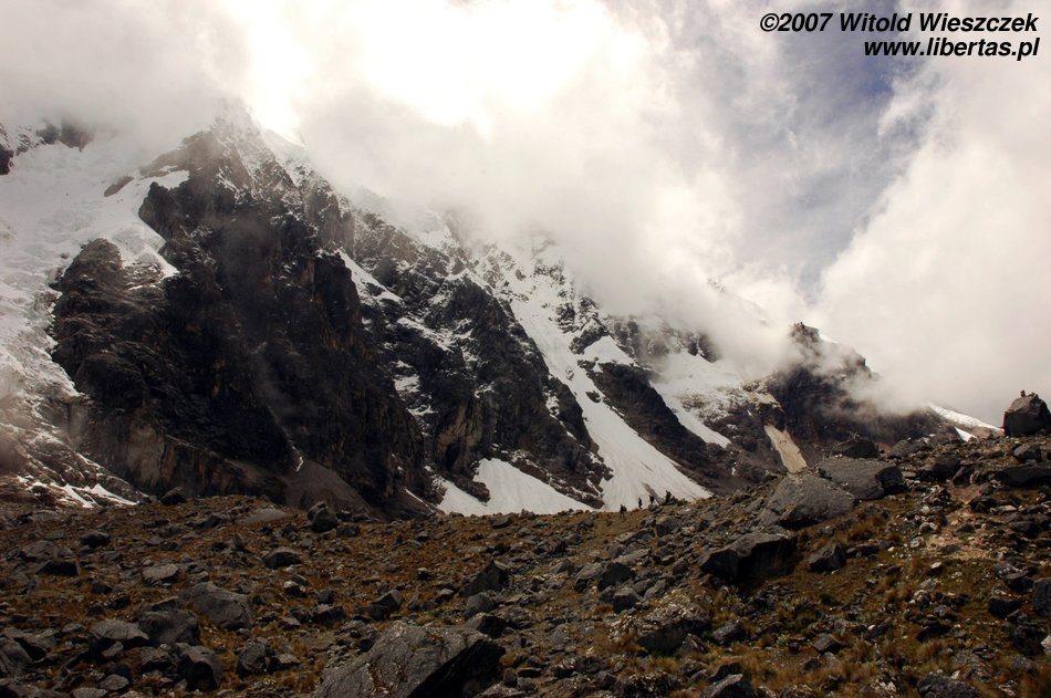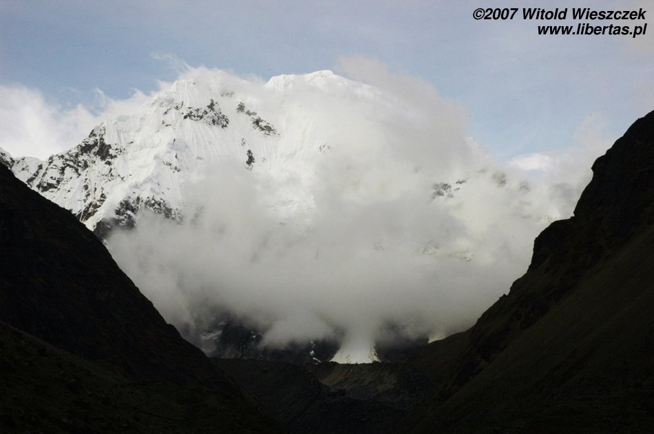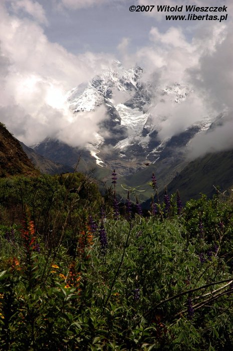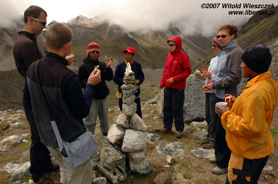 Po chwili docieramy na Przełęcz Salcantay, jesteśmy na wysokości 4800 metrów. Składamy w ofierze Pachamamie liście koki oraz wino, a nasz kucharz osobiście odmawia modlitwę, albo recytuje jakiś przepis kucharski w keczua, przecież i tak nie rozumiemy, co mówi. Niezależnie od tego panuje bardzo podniosła atmosfera.