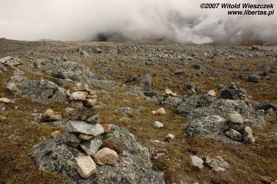 Po drodze jeszcze spotyka nas jakaś dziwna sytuacja z ludźmi, którzy nie chcieli nas wpuścić na teren rzekomego parku. Nie wiem, kto miał rację, Lenin czy oni. Na szczęście, po dłuższej dyskusji udało nam się przejść, ale było już coraz gorzej, idziemy bez przerwy coraz wyżej, powietrze jest coraz rzadsze (teraz już wiem, co to znaczy chorować na astmę), a co gorsza robi się coraz stromiej! Ostatni kawałek idziemy już po ciemku. Lenin ma przy sobie GPS, który w obozie pokazuje 4475 m n.p.m.
