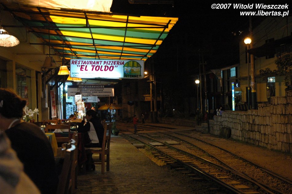 Pociągiem pojechaliśmy do Aguas Calientes – miasteczka położonego pod Machu Picchu. Po drodze widzieliśmy szczyt Waynapicchu i rzekę Urubamba. W miasteczku czeka na nas kolacja – cały peron to jedna wielka restauracja! Założę się, że jest tu więcej turystów niż mieszkańców!