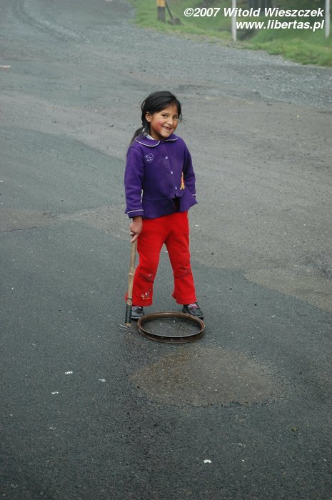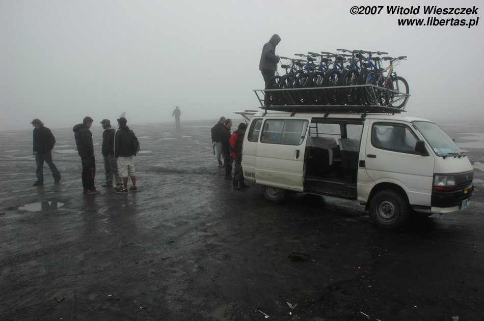 Na wypadek gdybym skończył w przepaści, aparat zostawiłem w samochodzie, a zdjęcia robiłem tylko w trakcie postojów. Zjazd ma podobno długość około 70 km i kończy się na wysokości 1200 m n.p.m., jesteśmy więc 3525 metrów niżej niż rano! Cali jesteśmy ubłoceni, bo w rowerach nie ma błotników, pewnie po to, by turysta miał więcej wrażeń. Śpieszymy się na autobus, więc tylko szybko myję twarz, żeby nie straszyć ludzi.