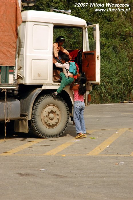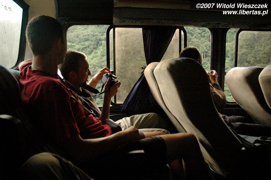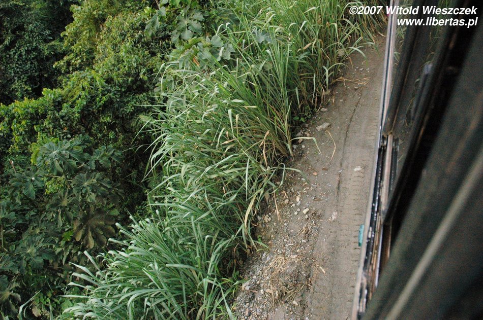 Jak widzicie „droga” ma tylko jeden pas ruchu i nie ma pobocza, a od razu przechodzi w urwisko. Kiedy z przeciwka jedzie samochód – autobus wykonuje skomplikowane manewry, aby go przepuścić. Siedzimy na samym tyle, więc co jakiś czas, wychylając się przez okno, stwierdzamy, że cały tył autobusu wisi nad przepaścią. Wystarczy, że kierowca trochę niedokładnie oszacuje odległość i tylne koła na bank obsuną się w przepaść. Pytanie, czy na tym się skończy...