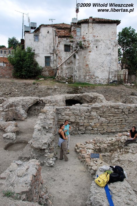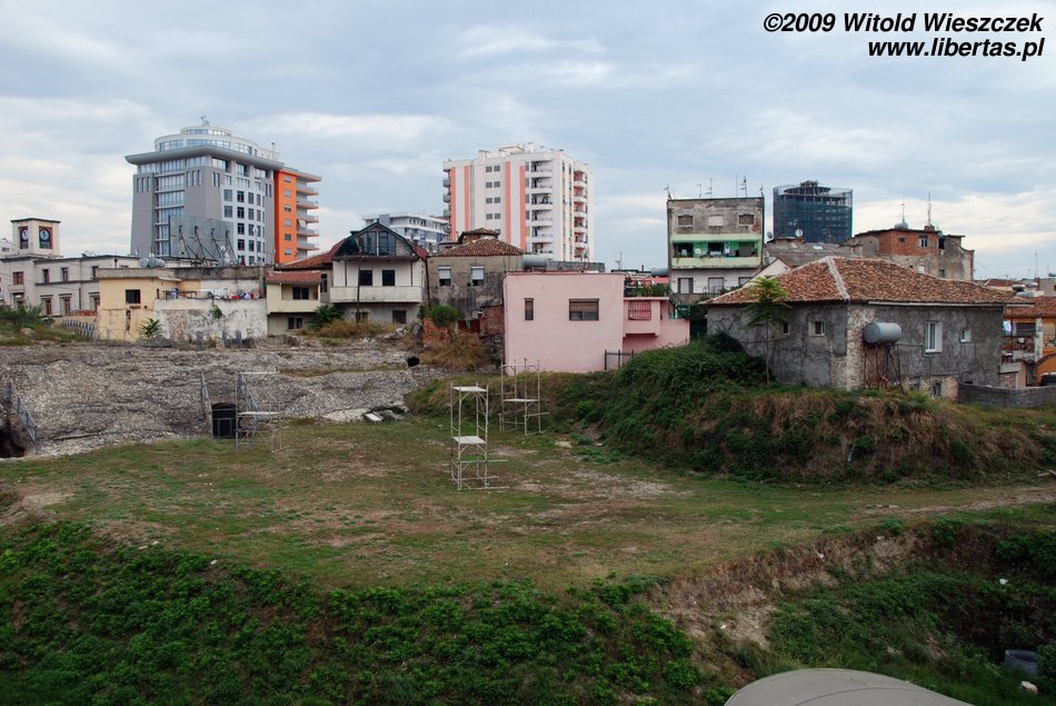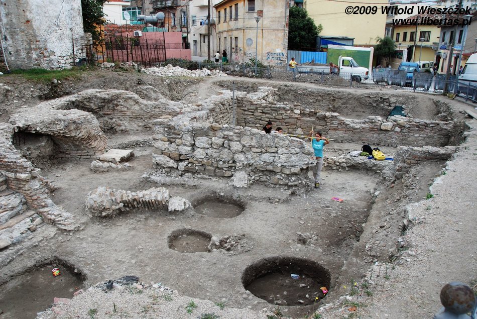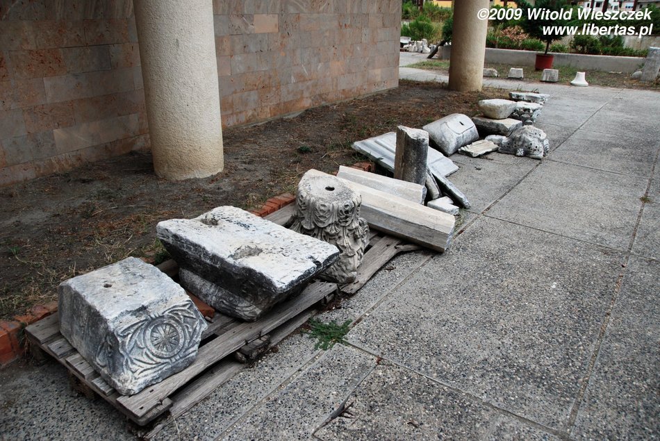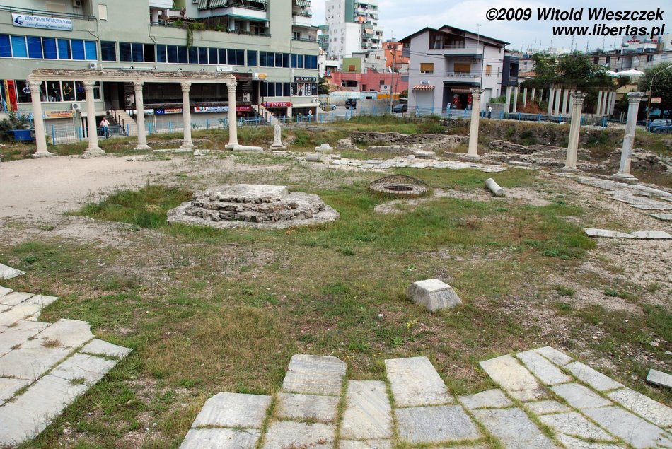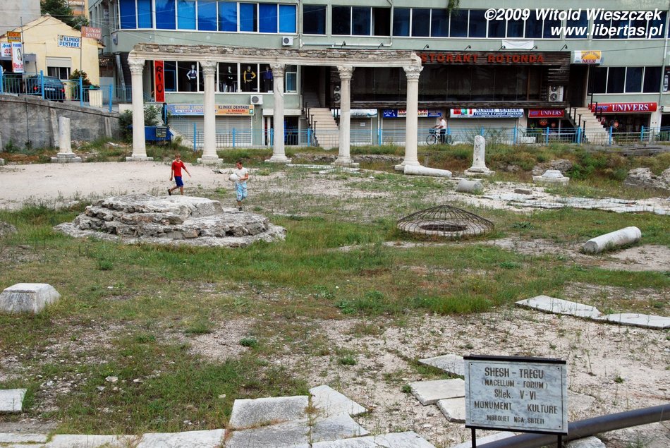 Going down the Shevget Bej Street from the square at which the mosque stands, on the right we will pass by the remains of a Roman forum, melted into the socialist blocks of flats, as it usually happens in Albania. As a mettter of fact, the forum has been fenced, but even children don't treat the protection seriously, and, as if nothing happened, play football in those ancient environmental circumstances...