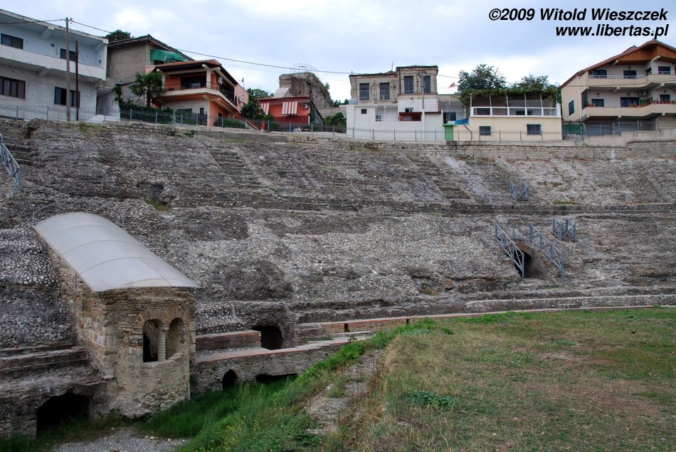 After the visit to the museum, we can go back a short distance in the direction of the tower, and then turn left into Epikadëve Street. On the way, we will see the remains of a wall from the Byzantine times, which unfortunately was pulled down by the Turks for the most part. Having passed the gate, we will get to the Antique Amphitheatre, which hadn’t been discovered until 1996, when one local man started digging a well in the garden. Suddenly, the soil under his feet sank, and he fell into one of the corridors. Shortly after that, other buildings started to subside and a few families had to be evacuated from here.