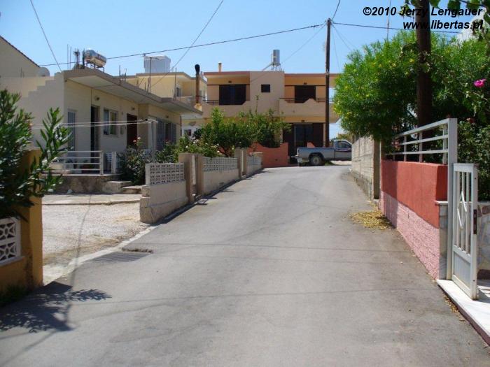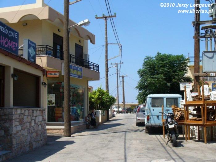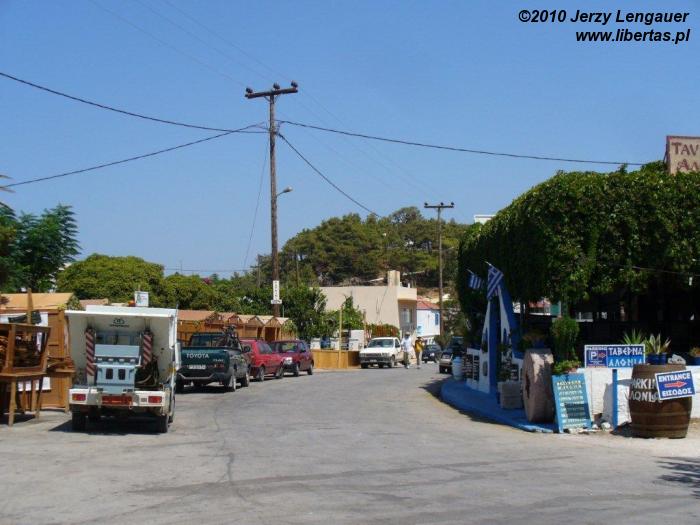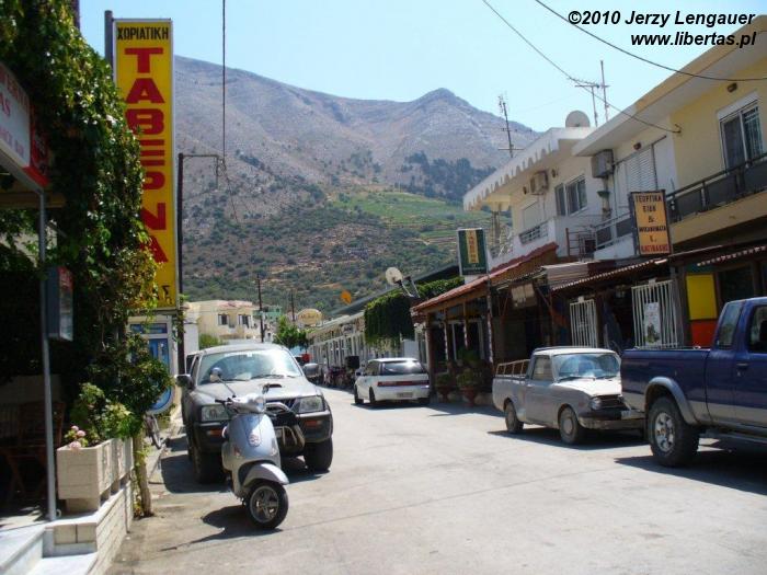 Wracamy przez góry. Najpierw mijamy od prawej Akramytis i wjeżdżamy do Siany. Potem jeszcze bardziej pod górkę i z prawej mamy Attavyros. Siana bardzo malownicza, z białymi domkami na zboczach. Wąskie, puste uliczki. Po bokach pełno skuterów, motocykli. Cicha, spokojna miejscowość w górach. O dziwo wszystko świetnie oznaczone, pomimo, że są to tylko stare, małe, zardzewiałe tabliczki. Po kilku, a może i kilkunastu zakrętach, po wznoszeniu się i opadaniu pośród domów, pomiędzy którymi a jezdnią nie ma chodników kierujemy się na Emponas. To dziwne, ale chyba dotychczas nie widziałem żadnej dziury w asfalcie. Być może nawet ani jednej łaty. Niewiarygodne, jak dobre są tutaj nawierzchnie. Jednak należy uświadomić sobie, że jeździmy przecież po głównych szosach wyspy, jak wąskie by nie były. Pamiętam, co mówił W. Lepiej wybierać drogi oznaczone na mapie jako główne. Pomarańczowe lub żółte. Reszta może być po prosta drogami gruntowa, nawet jeżeli wjeżdżając w takie na początku jest asfalt. Potem może być piach, skała, kamienie, brak miejsca na zawrócenie i kłopot gotowy. Zjeżdżamy z góry, wprost spod Attavyrosa, do Emponas. W porównaniu do znanych nam dotychczas miejscowości, to prawie metropolia. Podobno jest to centrum winorośli i tym samym oczywiście wina. Okazuje się, że nie tylko, bo także miodu i ouzo, greckiej wódeczki. Podobnież to właśnie w sierpniu ma tutaj miejsce święto wina. Wyobrażam to sobie jako ulice przystrojone plakatami, flagami, transparentami, banerami. Na chodnikach mnóstwo ludzi przy koszach i beczkach pełnych winogron, soku z winogron, podających przechodniom szklanki z młodym winem z butelek ukrytych w cieniu domów. Nic z tych rzeczy. Na szerokiej, nawet bardzo szerokiej ulicy, która dzięki wielu odnogom w różnych kierunkach tworzy coś w rodzaju placu, jest jakiś festyn, ale… kolarski. Pełno dzieci, młodzieży i dorosłych na rowerach. Widać także świetnie ubranych turystów, na doskonale wyposażonych rowerach. Niektórzy z miejscowych rowerzystów w strojach, jakby wzięci prosto jakby z Tours de France. Mam wrażenie, że przed chwilką zakończył się tutaj jakiś wyścig i właśnie skończono rozdawać nagrody, honorować zwycięzców, uczestników. Jest kolorowo, gwarno i tłumnie. Lubię to. Można przeciskać się w tłumie, idąc środkiem jezdni. Można omijać go z daleka, chroniąc się pod cieniem sklepowych markiz. Można w końcu usiąść przy stolikach w restauracji, która zaaresztowała sobie chodnik, stawiając wygodę turystów ponad administracyjne prawo własności.