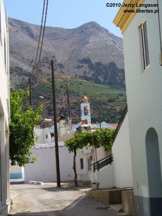 Jeżeli wspinając się do twierdzy Monolithoss mieliśmy poczucie, że znajdujemy się w skalnym, górskim ogrodzie, to tutaj przy tych samych barwach, czyli zieleni, błękicie i bieli, spacerujemy po ogrodzie miejskim. Do tych barw należy dodać jeszcze pomarańcz i żółć. To owoce. Zza białych, bardziej ozdobnych niż odgradzających również białe domy, murków pochylają się nad jezdnią pomarańcze, opuncje, cytryny. Nikt ich nie zrywa, ale i nikt nie pilnuje. Wszechogarniający uliczny, skwarny kurz nie jest tak uciążliwy, gdy spacerowi towarzyszą owoce. Trochę nieelegancko, ale co chwila zaglądam w podwórka, w bramy. Sporo domów zbudowanych jest kaskadowo. Różnice w poziomach tworzą małe, biało ceglane podwórka. Jeżeli pojawia się na zapleczu głównej ulicy jakieś życie, to właśnie tam, gdzie na schodkach, progach, małych murkach siedzą mieszkańcy, paląc papierosy, pijąc kawę, grając w tryktraka albo po prostu będąc bezczynnie w trakcie sjesty. Robimy dość duże koło. Patrzymy na zbocza Attavyros, gdzie zielenią się winorośla. Na tym tle słupy wysokiego napięcia i szczupła, zgrabna niebiesko-biała dzwonnica z delikatnym krzyżem.