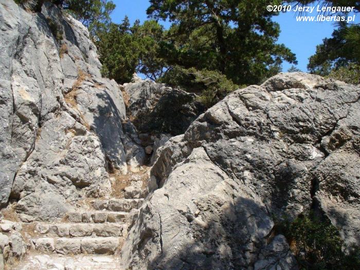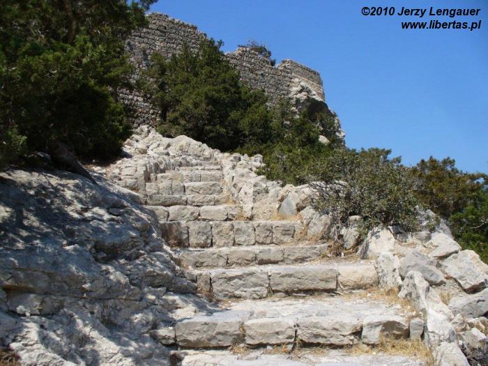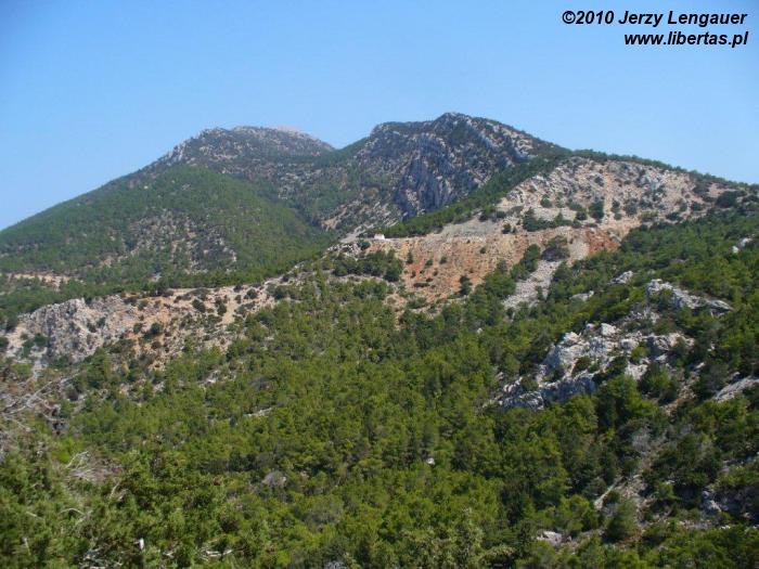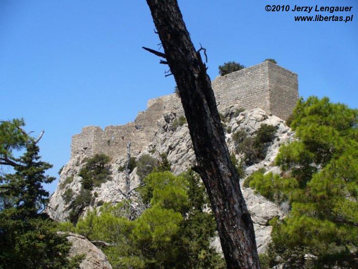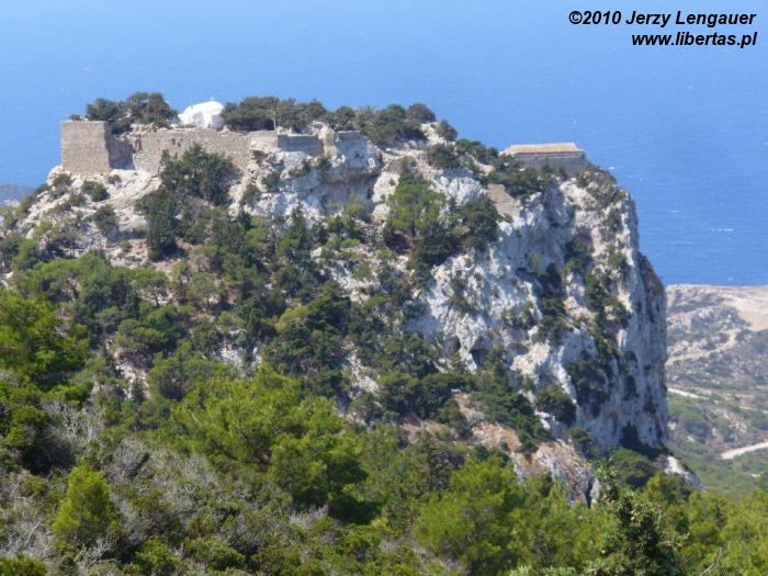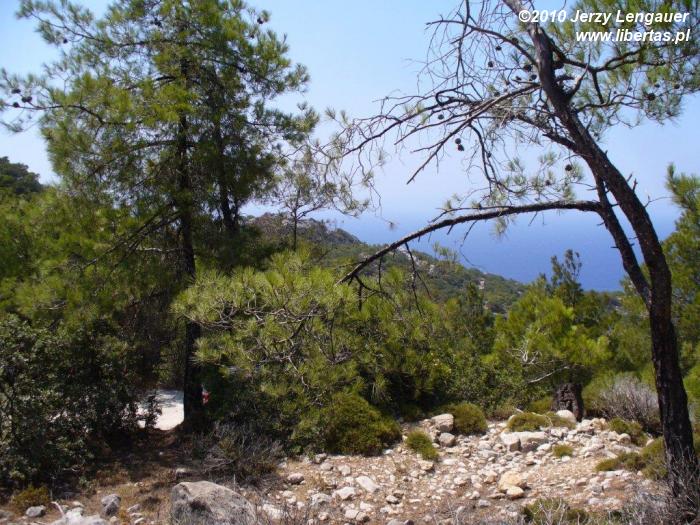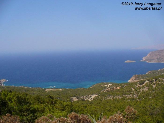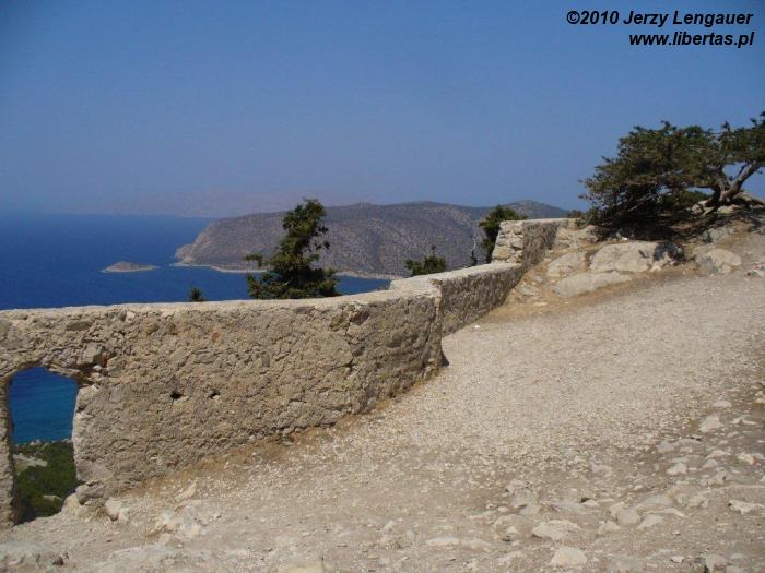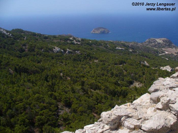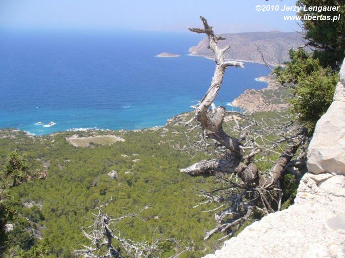 Wysiadamy z auta i od razu łapiemy się za kapelusze. Takie wiatru to jeszcze na Rodos nie odczuwaliśmy! Gdyby wiatr porwał kapelusz, to zaniósłby go aż do Grecji kontynentalnej. Jak zwykle zanurzamy się w bezmiernym błękicie nieba i morza. Ale nie to jest tutaj najpiękniejsze. Jesteśmy na przedostatnim wyniesieniu przed linią brzegową. Za nami Akramytis, od którego oddziela nas wstęga jezdni zanurzona w lesie pluszowych igiełek i rzece białych odłamków skalnych. Aż do morza ciągnie się dywan niskich iglaków. Ten widok sprawia, że nie boję się podjeść do krawędzi. Wyobrażam sobie, że mógłbym spokojnie zejść na dół, a nawet gdybym się potknął i zleciał, to gałęzie spowolniłyby pęd i zamortyzowały upadek. Z tego dywanu wyrasta skała, której mało brakuje do wyglądu walca. Jest bielusieńka jak wieże filmowego Numenoru. Ale rzeczywistości przywracają ją nawtykane dość gęsto zielone krzaki. To znowu pozwala trochę pofantazjować. Jakbym ulepił z mokrego piachu wieżę, obłożył ją białymi kamykami, a w to wszystko powtykał drobniutkie kępki igiełek. Jakże niedaleko mi zatem do bogów? Z biało-zielonej mozaiki wyrasta, zdaje się ogromna, ściana. Widziane z tej odległości proporcje wprawiają w zdumienie.