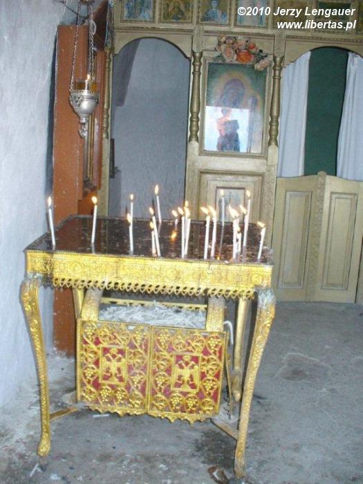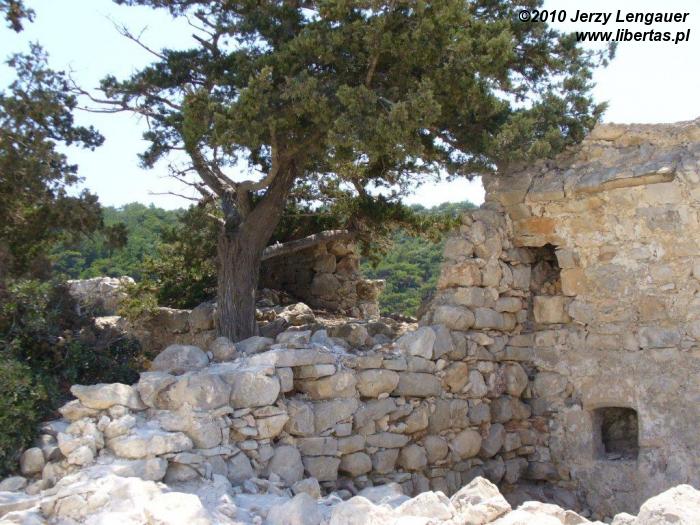 Jak zwykle żadnego parkingu, szlabanu, kasy biletowej. Wyjeżdżone pobocze przy skale. Nie zapominam skręcić kół i zaciągnąć ręcznego. Nas zapach kawy, a O. souvenirs kierują w stronę drewnianego czegoś, co zaczyna się drewnianym płotkiem, a kończy zapleczem pewnie wykutym w skale. Ach, jest i miodek. Później skojarzę, że to raczej w południowej części wyspy jest go więcej. Wpatrujemy się w nalepki. No tak, wiadomo, że honey, ale co dalej? Jedyne, co nam nieobce, to thyme. Miód tymiankowy? Dziękujemy, może gdzie indziej. Tutaj cena niezbyt atrakcyjna. Atrakcyjna jest za to ścieżka do warowni. Wykute, czy wydeptane w skale stopnie giną wśród karłowatych sosen. Ale nie można się nie zatrzymać. Takie widoki urzekają. Nie, poniekąd nie rzecz w krajobrazie. Bardziej fascynujący jest pocztówkowy widok: dająca cień sosna, pachnąca kora, pachnące igły, zza nich błękit i biel. Coś takiego urzeka w górach. Jakichkolwiek. Miejsce, które nie daje szerokiej panoramy, a jedynie delikatnie odsłania fragmenty krajobrazu. Pozostaję w miejscu, które igra barwami. Ruch gałęzi bawi się cieniem i promieniami słonecznymi. Gdzieś z boków i spod stóp przeraźliwie bieleją skały, nade mną i przede mną wszystkie odcienie niebieskiego, w które wplątane są brąz pni i zieleń igieł. Idziemy tym niezwykle kolorowym, urokliwym tunelem. Jest wąski, z każdej strony osłonięty, ale po kolejnym zakręcie rozpościera się przed nami przepiękny widok na środek wyspy. I wówczas E. i S. rezygnują z dalszej wspinaczki, zaś ja i O. wspinamy się dalej, nie przepuszczając okazji zdobycia następnej twierdzy. W końcu szara ściana przed nami. Trochę żal mi tej górskiej ścieżki. Żal, że tak szybko się skończyła. Ale z radością lawirujemy między szarą cegłą. Chodzimy między kolejnymi poziomami. Urzekają historią takie wymarłe miejsca. Urzekają ciszą. I znowu zbliżyć się do murów to ryzyko zsunięcia się w przepaść. Trzymam O. kurczowo za jedną ręką i w ten sposób pozwalam jej podejść jak najbliżej krawędzi. Sam też się zbliżam. Potrzebuję trochę czasu, żeby się przyzwyczaić i nabrać pewności. Dziura w murze pozwala O. na smakowanie wysokości i widoku morza. Opieramy się o gorące cegły. Szuramy w białym piachu, w tej swoistej posadzce, którą stworzyli wspólnie skały i wiatr. Każdy fragment krajobrazu w zasięgu naszego wzroku jest przepiękny. I sosny wyrastające wprost ze białej skały. I kępy zeschniętej szarobrązowej trawy siedzące jak jakieś dzikie ptaszyska w załomach cegieł i kamieni. I wyschłe pnie, całkiem białe, jak kości jakiś prehistorycznych zwierząt. Strasznie i pięknie. Cicho i skwarno. Nie mogę ponownie nie podziwiać tego przejmującego związku natury i ręki człowieka. Żeby tego było mało, to za nami, z wielkich półokrągłych fragmentów białej skały wyrasta coś jeszcze bielszego z małym czarnym otworem. Niesamowite! To cerkiew. Oczywiście wchodzimy. Niezwykle małe pomieszczenie. Z zewnątrz wygląda jak fragment pueblo. Gdyby nie krzyż na szczycie. Ale i krzyż sympatyczny. Jak na tak wywyższone miejsce to nie jest nachalny. Raczej niewielki. Nie rości sobie praw do górowania nad całą okolicą. Nie przyciąga wzroku lądowych i morskich podróżników. Widać, że chwalebna jest tu bardziej religijna skromność niż polska krucjata w rodzaju krzyża na Giewoncie czy ogromu Świątyni Opatrzności Bożej. Dwa czy trzy drewniane krzesła. Z rodzaju takich składanych. Trochę nie pasują. Ale co tu na Rodos do siebie pasuje? Jakiś stoliczek ze świeczkami i ceną za jedną. Nie korzystamy. Wpatrujemy się w ściśnięty w głąb ikonostas. Jaki niewielki. Czy za nim jest jeszcze miejsce dla popa?