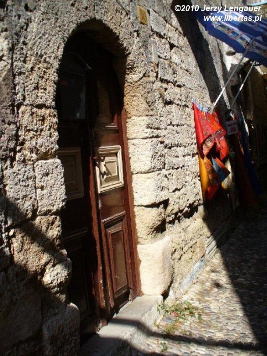 Jeszcze trochę kluczenia pomiędzy motocyklami i samochodami zaparkowanymi przy krawężnikach na światłach alarmowych i wyjeżdżamy z Paradissi. Przemykamy koło lotniska i na światłach, gdzie żaden z samochodów nie pilnuje rygorystycznie ustawienia się na właściwym pasie. Tym bardziej, że pasy są ledwo zaznaczone, ledwo widoczne. Jeszcze zjazd pod jednokierunkowym mostem, trochę przestrzeni obok pasów startowych lotniska i wjeżdżamy do jednej wielkiej miejscowości, składającej się między innymi z Kremasti i Jalissos, a zakończonej na Rodos. Po drodze trochę tego, co już znamy. Żółto pomarańczowy tunel kamieniczek. Ale za chwilę robi się luźniej i gwarniej. Pojawiają się szersze chodniki. I w ogóle chodniki. Na moje oko dwie osoby mogą w miarę swobodnie iść obok siebie! Ulice ocienione drzewami i markizami sięgającymi aż do krawężnika. Co chwila zawłaszczające chodnik stoliki i stojaki z owocami. Sklepy, kioski z gazetami. To wszystko sprawia wrażenie niezwykle sympatycznego miejsca. Z jednej strony przyjaźnie ocienionego, z drugiej pozbawionego samotności przez kręcących się wokół swoich stolików i owoców właścicieli, restauratorów, sklepikarzy.