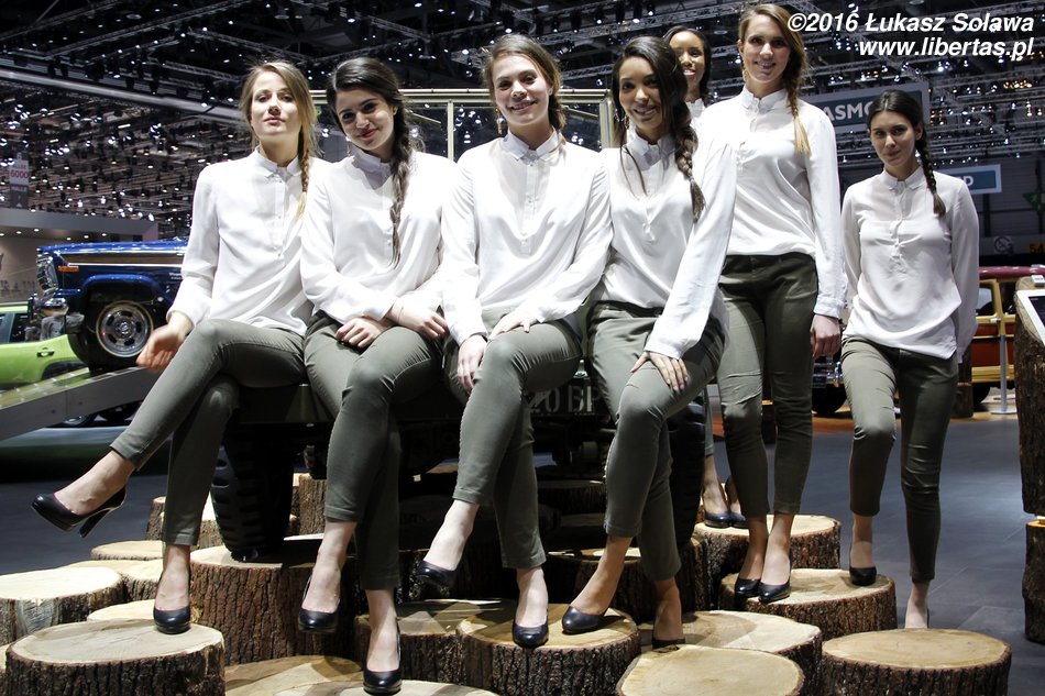 Drugą grupą zawodową – że się tak wyrażę – obecną na genewskich targach były tzw. dziewczyny marki, czyli po prostu konsultantki. Ich zadaniem, prócz schludnego wyglądu, było również udzielanie mniej lub bardziej wyczerpujących informacji na temat produktów. Chyba najwięcej konsultantek miał Jeep. Każda z dziewczyn tej marki miała przydzielony konkretny model samochodu, na temat którego mogła udzielić obszernych informacji. Prócz elokwencji i sporej wiedzy dziewczyny Jeepa cechowała uroda i poczucie humoru. Pomimo że nie paradowały w krótkich czy obcisłych sukienkach, a jedynie w oliwkowych jeansach i białych koszulach, to i tak miały sporo chętnych do fotografowania się z nimi, z czym zresztą nie miały najmniejszego problemu.