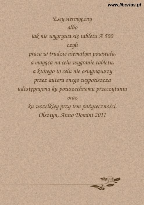 Jeśli mam być szczery, to nie mam bladego pojęcia, jaka jest najatrakcyjniejsza cecha modelu A500, ani tym bardziej jak uzasadnić, dlaczego taka właśnie cecha jest dla mnie najistotniejsza. A jeszcze do tego mam to zrobić w jak najciekawszy sposób... Wiem, że bardzo chciałbym wygrać ten tablet. Jeśli go wygram, to Bóg mi świadkiem, że najatrakcyjniejszą cechą modelu A500 będzie właśnie fakt, że mogłem go wygrać. Spróbuję jednak stanąć na wysokości zadania i uczciwie zasłużyć na nagrodę. Jako że za diabła nie znam się na parametrach technicznych różnej maści tabletów, aj-podów, aj-padów czy innych aj-wajów, pozwolę sobie skorzystać ze ściągi w postaci zaczerpnięcia odrobiny informacji z pewnej fachowej strony. Otwieram stronę, szukam... o, proszę bardzo, jest takie piękne zdanie: "Tylny panel tego tabletu o przekątnej 10,1 cala jest pokryty cienką blaszką ze szczotkowanego aluminium, która zachodzi aż na przedni panel i otacza jego boki o długości 260 milimetrów". Uważam, że w tej wyczerpującej (o, jak jeszcze!) informacji zawiera się cała kwintesencja najistotniejszej najatrakcyjniejszości naszego urządzenia. Czegóż bowiem możemy dowiedzieć się o modelu A500 z tego zdania? Po pierwsze: posiada on tylny panel. Od dziś możemy zapomnieć o tabletach, które w takowy nie zostały wyposażone. Po co nam takie? Teraz mamy tablet z tylnym panelem i kiedy tylko chcemy, możemy sobie zrobić z niego użytek. Jakże uboższy był świat, gdy tablety nie posiadały tylnego panelu! Taki tablet bez tylnego panelu to właściwie nawet nie był tablet, tylko... bo ja wiem, ćwierćtablet może. Albo nawet lekkopółćwierćniwpięćniwdziewięćtablet. W każdym razie A500 posiada tylny panel i basta! Można go sobie obracać w ręce: z przodu ma przód, z tyłu tylny panel - i szafa gra. To jest ewidentny znak, że świat idzie naprzód z duchem postępu. Nie ma zastoju. Nie ma marazmu. Nie ma wiecznej zmarzliny.